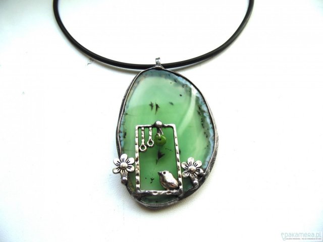 Wisiorek wykonany techniką witrażową z miedzi, cyny i agatu. Zawieszony na czarnej lince kauczukowej o długości ok. 45 cm. Wymiary ok. 7 na 4,5 cm.