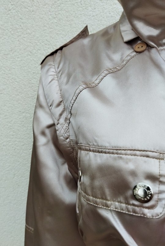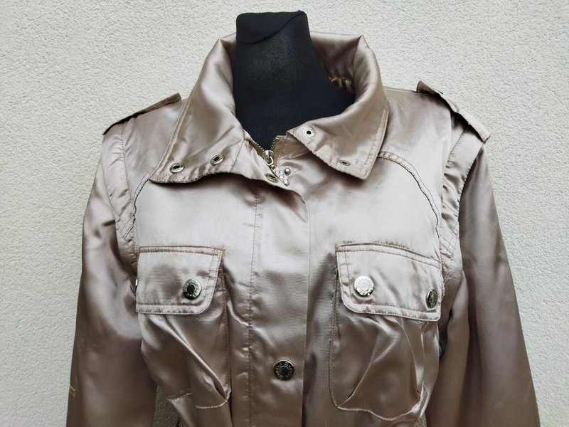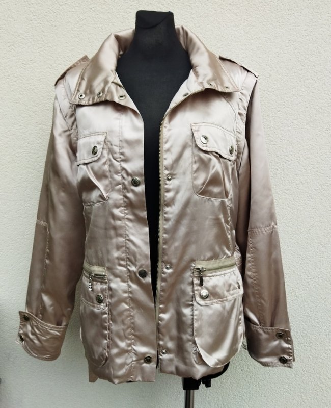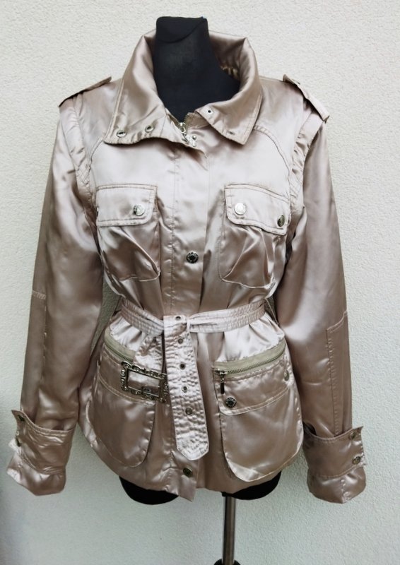 Przejściowa lekko ocieplana kurtka w lekko metalicznym szampańskim kolorze , starannie uszyta z licznymi detalami. Dwufunkcyjna - z odpinanymi rękawami można nosić ja również jako kamizelkę. Z kołnierzem stójką , z czterema przestrzennymi kieszeniami z patkami zapinanymi na napy i naszywanymi zamkiem z zawieszka z cyrkoniami, rękawy z szerokim patkami zapinanymi na napy z dwustopniowa regulacją. w talii pasek z klamerką . Zapinana na zamek ukryty pod plisą zapinaną na napy. Całość na pikowanej podszewce w zwierzęcy print. Ładniejsza w realu.