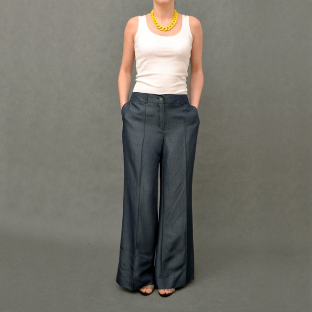 Świetne spodnie z miękkiego i lejącego materiału imitujący dżins. Z przodu na nogawkach szew imitujący kant. Po bokach kieszenie. Nogawki szersze. Polecam bardzo.