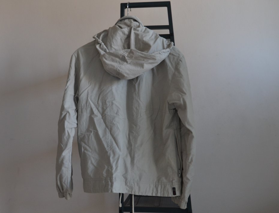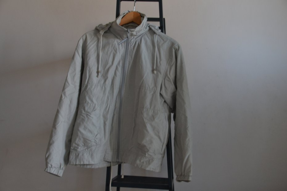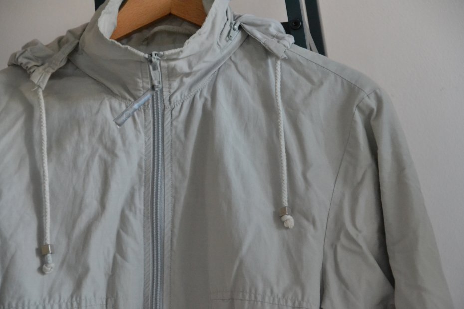 Cienka kurteczka z wyciąganym z kołnierza kapturem i dużymi kieszeniami na zamek.