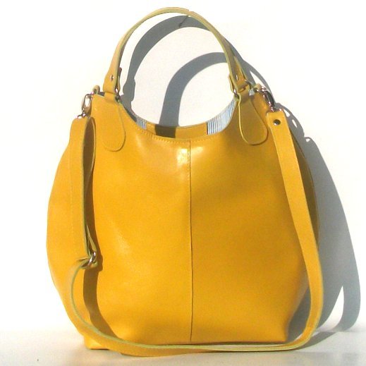 Duża skórzana torba uszyta ze skóry naturalnej licowej - żółtej w odcieniu dojrzałej cytryny. Przód i tył przestebnowane. Zapinana na magnes, wyłożona stylowym płótnem w paseczki; wewnątrz kieszonka zapinana na zamek i 2 kieszonki skórzane na komórki. Dno usztywnione, na dnie metalowe nóżki, okucia srebrne. Uchwyty - do noszenia na ramię w komplecie też długi doczepiany pasek do noszenia na skos. Wymiary torby: wys. na środku 31 cm , szer. na środku 40 cm, gł 14 cm.