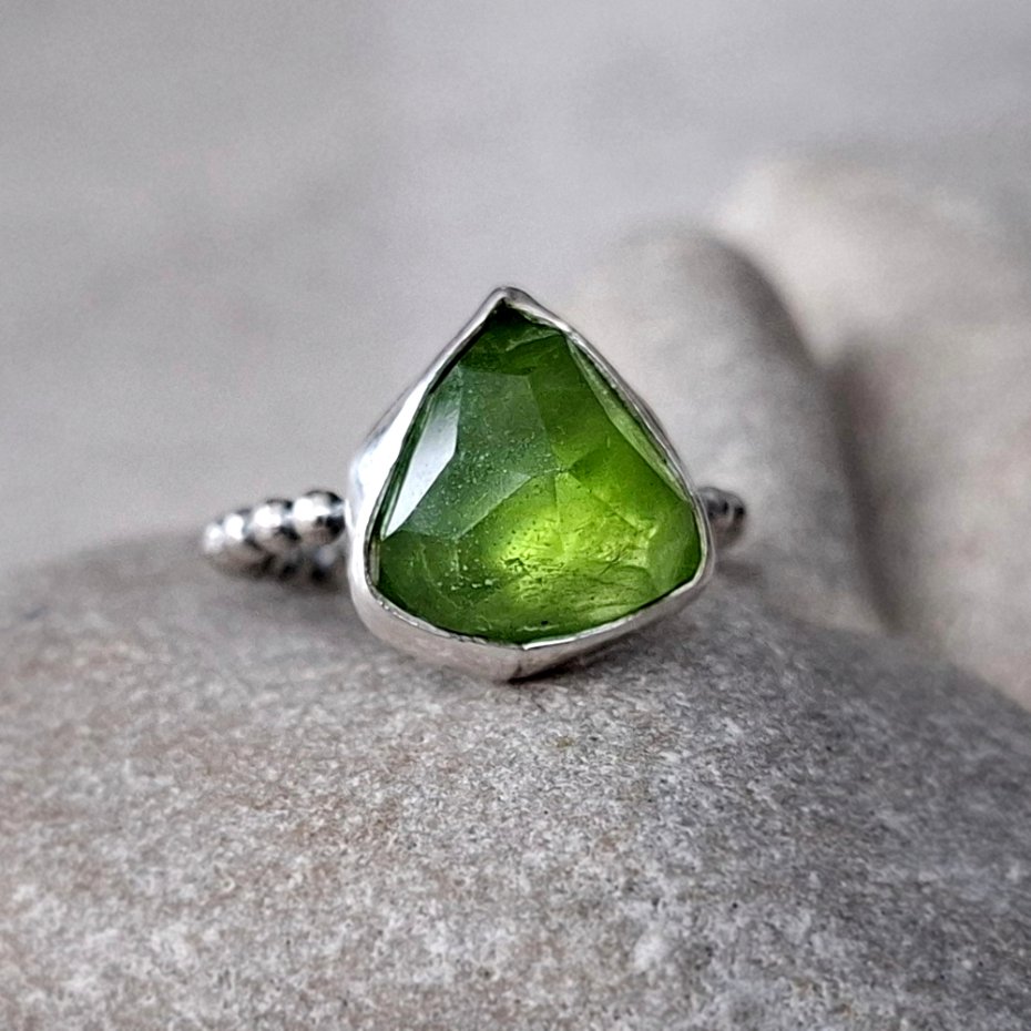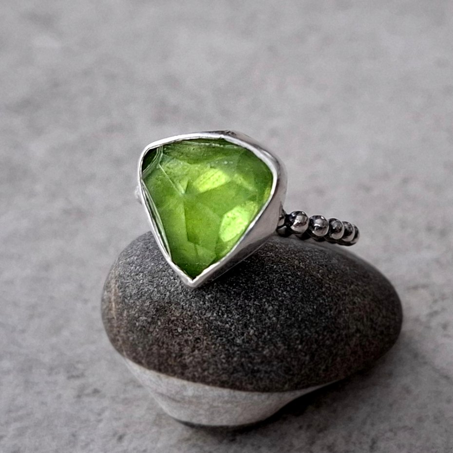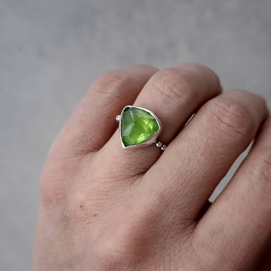 Delikatny, srebrny pierścionek ozdobiony fasetowanym zielonym peridotem. Korona pierścionka została osadzona na delikatnej ozdobnej obrączce. Całość wykonana ręcznie ze srebra 925 w jednym niepowtarzalnym egzemplarzu. Wymiary korony pierścionka: ok 14x14 mm. Rozmiar obrączki 14,5. Biżuteria zostanie ozdobnie zapakowana.