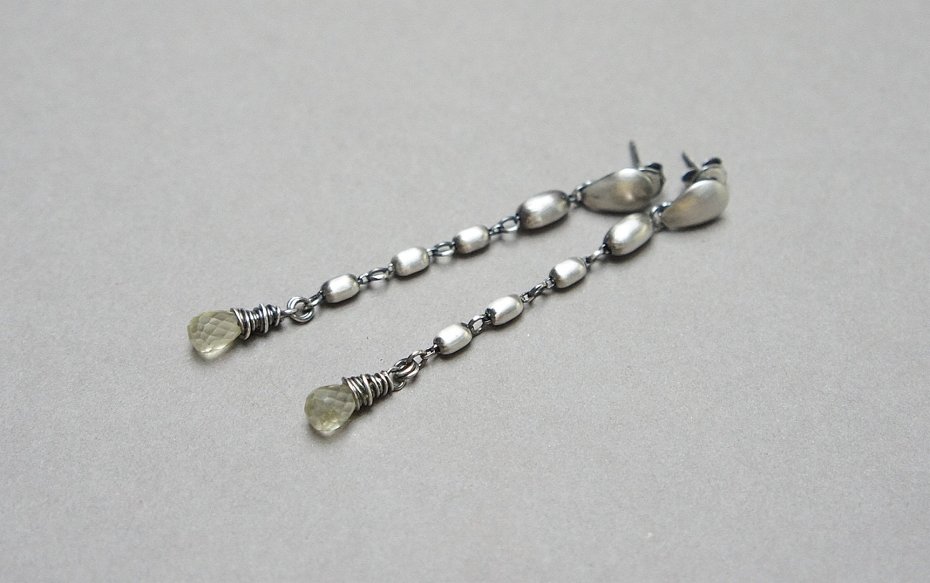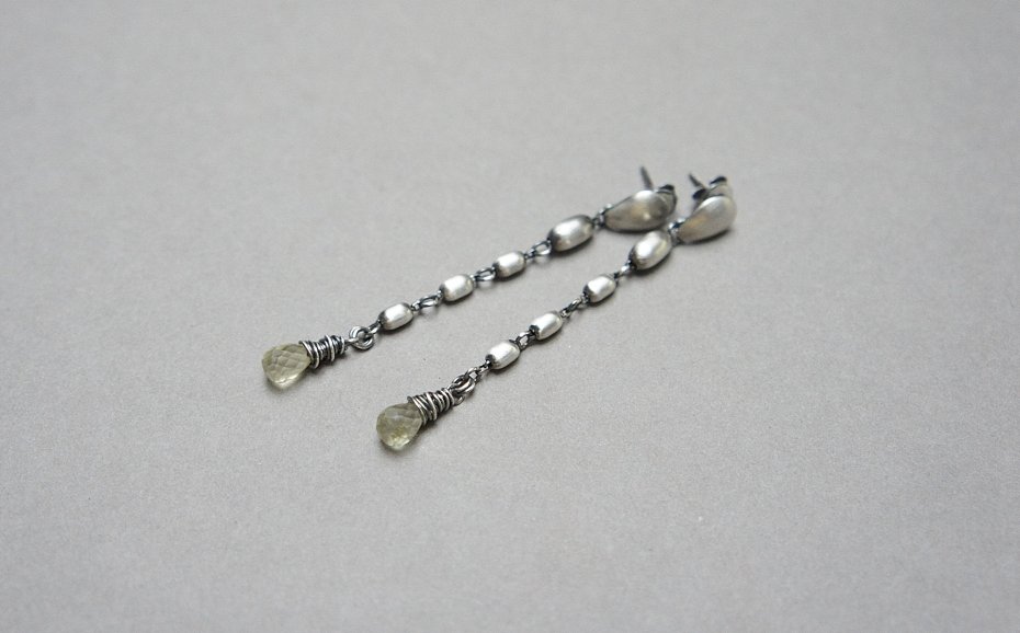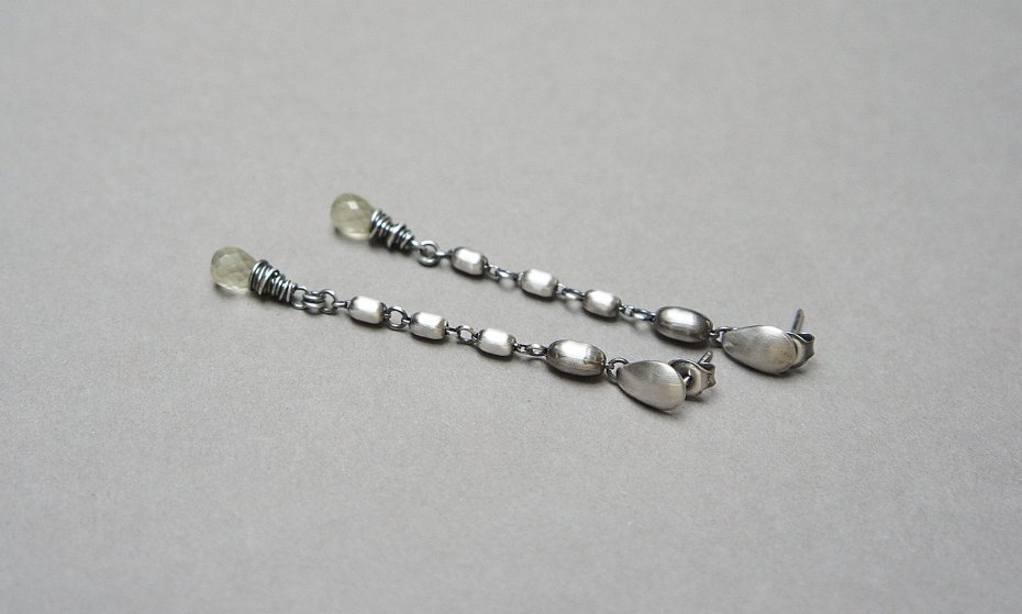 Kolczyki wykonane ze srebra [pr.925] w połączeniu ze srebrnymi oliwkami oraz brioletkami kwarców lemon [9mm]. Srebro oksydowane i przetarte. Całkowita długość kolczyków około 6,2cm. Biżuteria ozdobnie zapakowana.