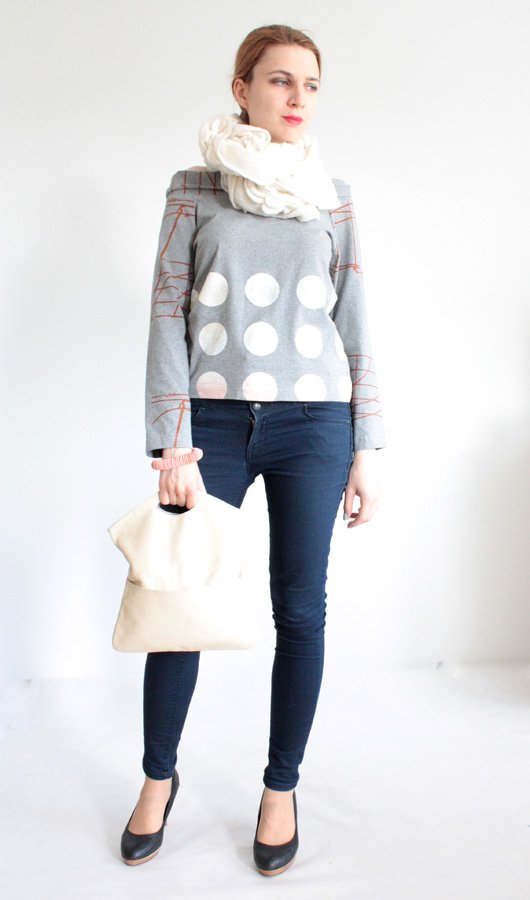 Oryginalna bluzka duńskiej marki Lene Molby Design. Grochy w przelewanych kolorach ( z przodu biel przechodzi ku dołowi w jasny pudrowy róż na zasadzie gradientu). Dekolt można układać na różne sposoby. Materiał jest elastyczny.