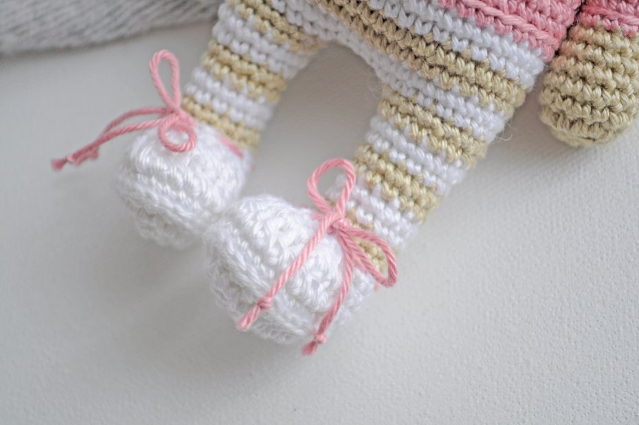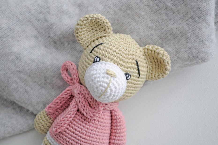 Materiał: bawełna, tiul (podszycie sukienki), puch antyalergiczny, satynowa wstążka (kokardka przy uchu)