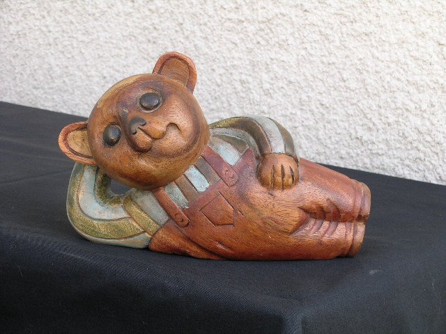 Duuuuży drewniany Miś, ręcznie z jednego kawałka drewna wyrzeźbiony. Dekoracyjność słojowego materiału i malowane wdzianko Bohatera :) Imponująco wielgaśny i dosyć ciężki - 23 x 10,5 x 13 cm. Zaolejowany, ręcznie malowany. Stan zachowania dobry. Dowcipny i dekoracyjny. Świetny do pokoju dziecka lub w okolice książkowych półek.