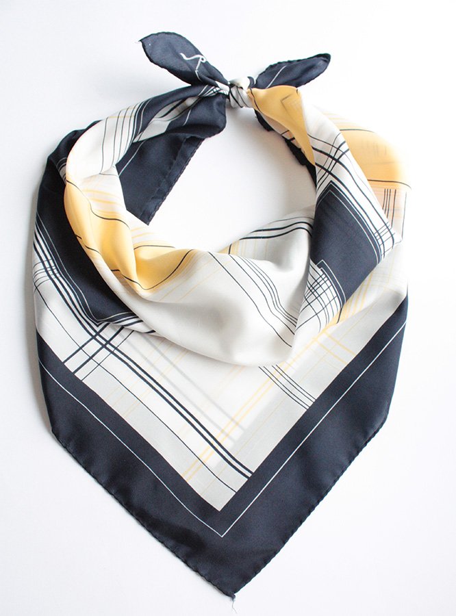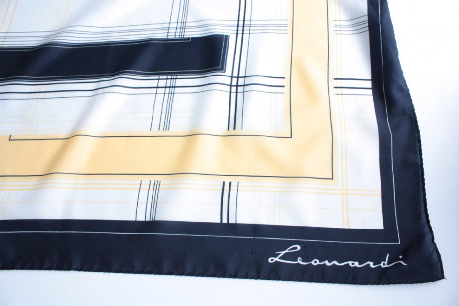 Oryginalna chusta marki Leonardi w odcieniach granatu, żółtego i bieli. Materiał to prawdopodobnie poliester.