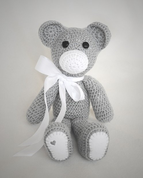 Leoś ma ok.30cm wzrostu i szare umaszczenie. Dodatkową ozdobą misia jest małe szare serduszko na stopie i biała szeroka wstążka. Misia wykonano z miękkiego akrylu i filcu, wypełnienie to puch antyalergiczny. Doskonały na prezent lub jako ozdoba pokoju dziecięcego. Miś nie stoi samodzielnie. 100% handmade :)