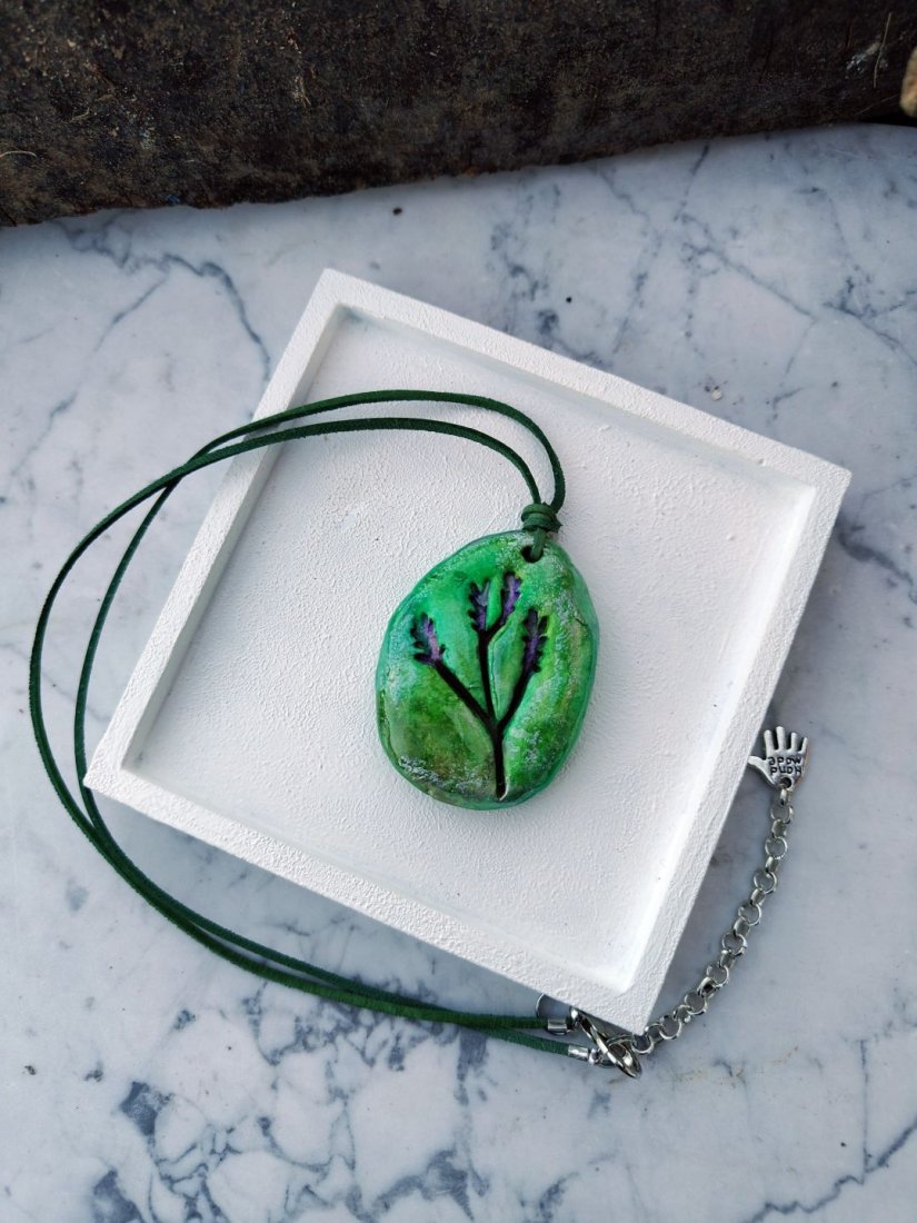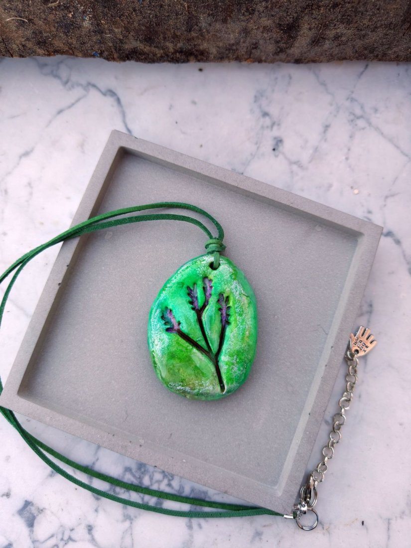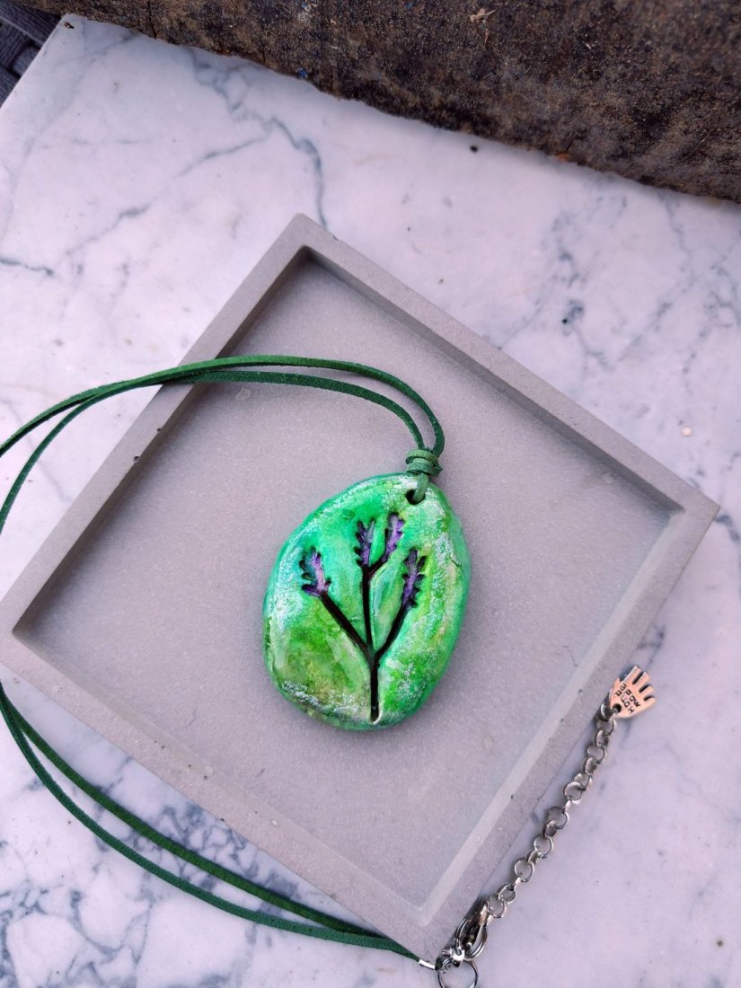 Leśna Harmonia to wyjątkowy, ręcznie malowany i wykonany wisiorek z glinki samoutwardzalnej, inspirowany naturą i subtelnym pięknem roślinnych motywów. Zielona, nieregularna forma przypominająca kamień została ozdobiona delikatnym reliefem gałązki z fioletowymi akcentami, co nadaje całości artystycznego i niepowtarzalnego charakteru.