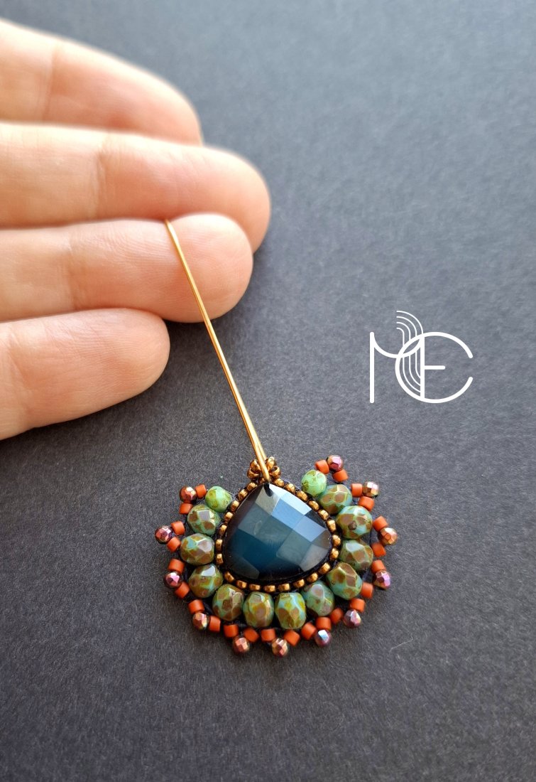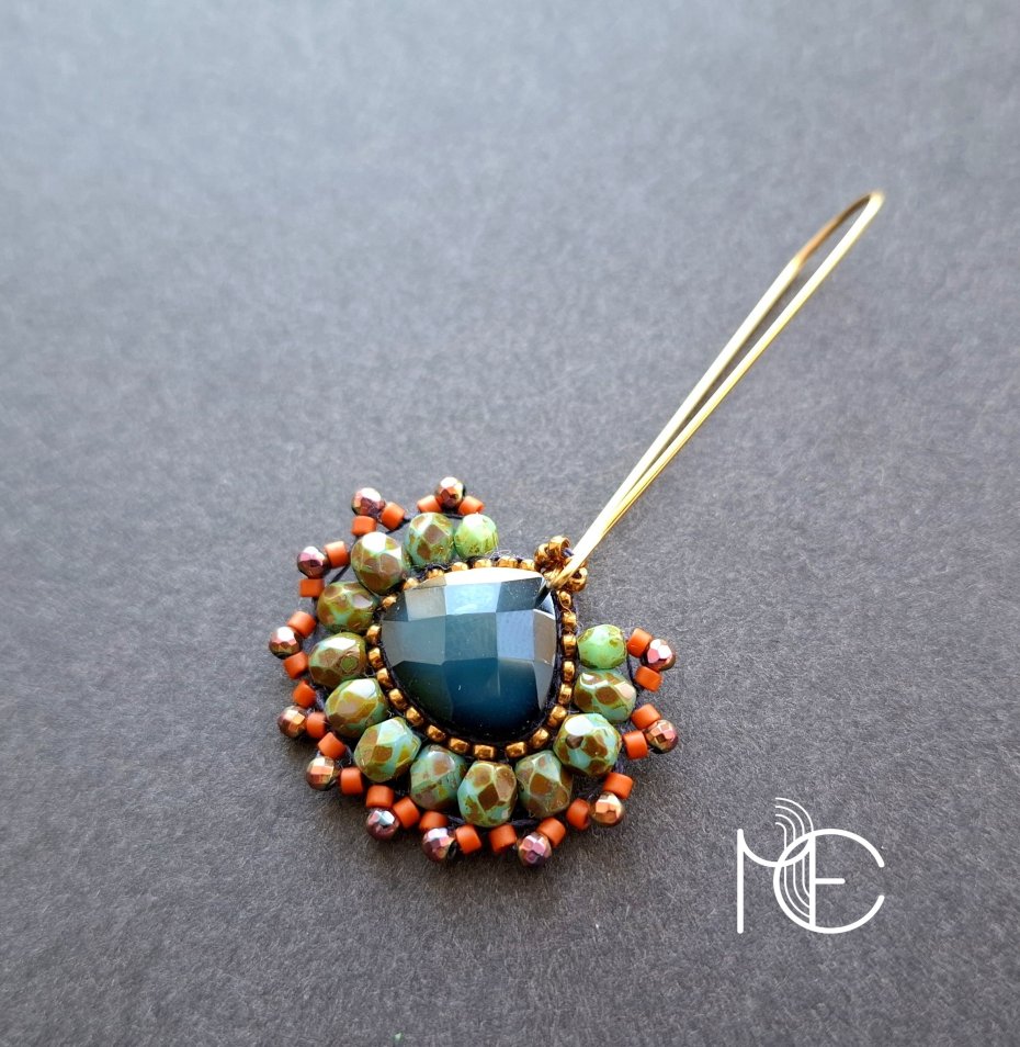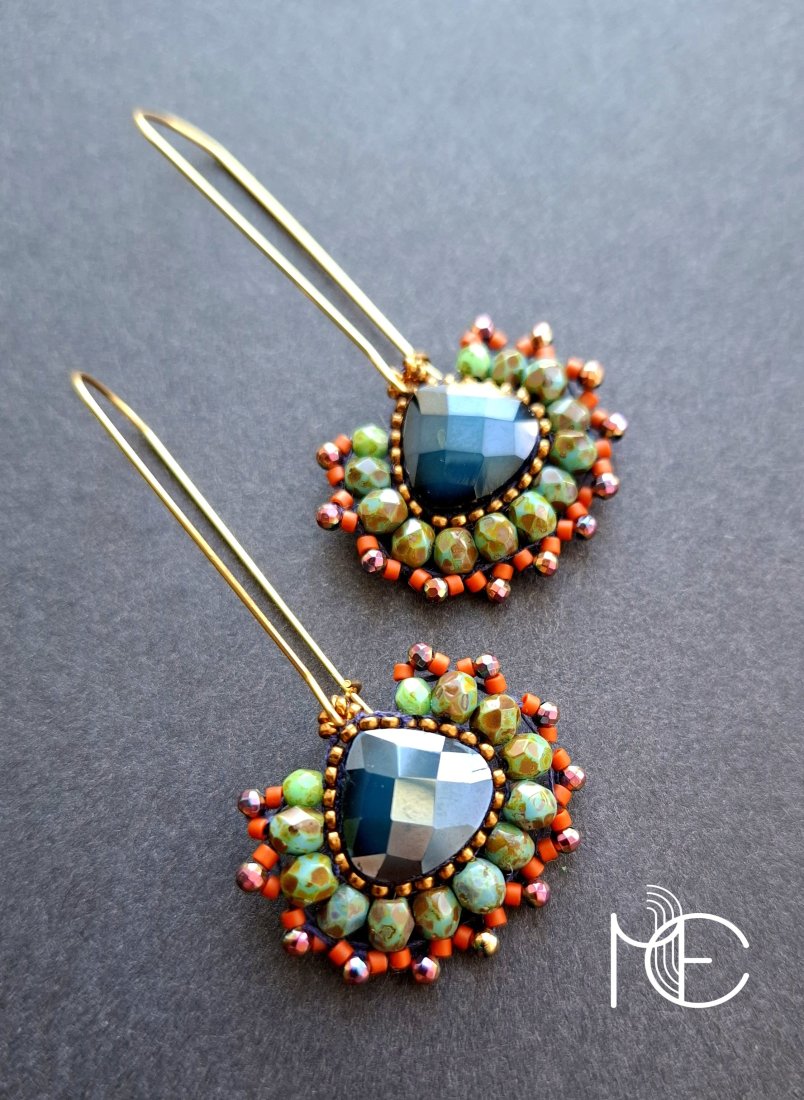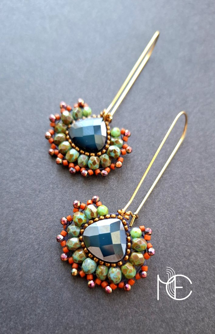 Długie kolczyki wiszące na prostych, pozłacanych biglach; wykonane techniką swoistego haftu drobnymi szklanymi i kryształowymi koralikami; jak i hematytem platerowanym. Dwustronne podwieszone na pozłacanych i nieuczulających biglach. Wymiary: długość wraz z zapięciem - 6 cm, szerokość max. 2,8 cm. Wykonane w jedynym egzemplarzu.