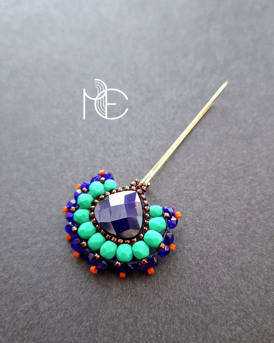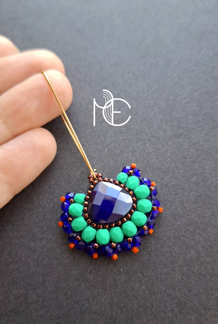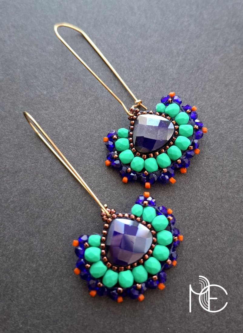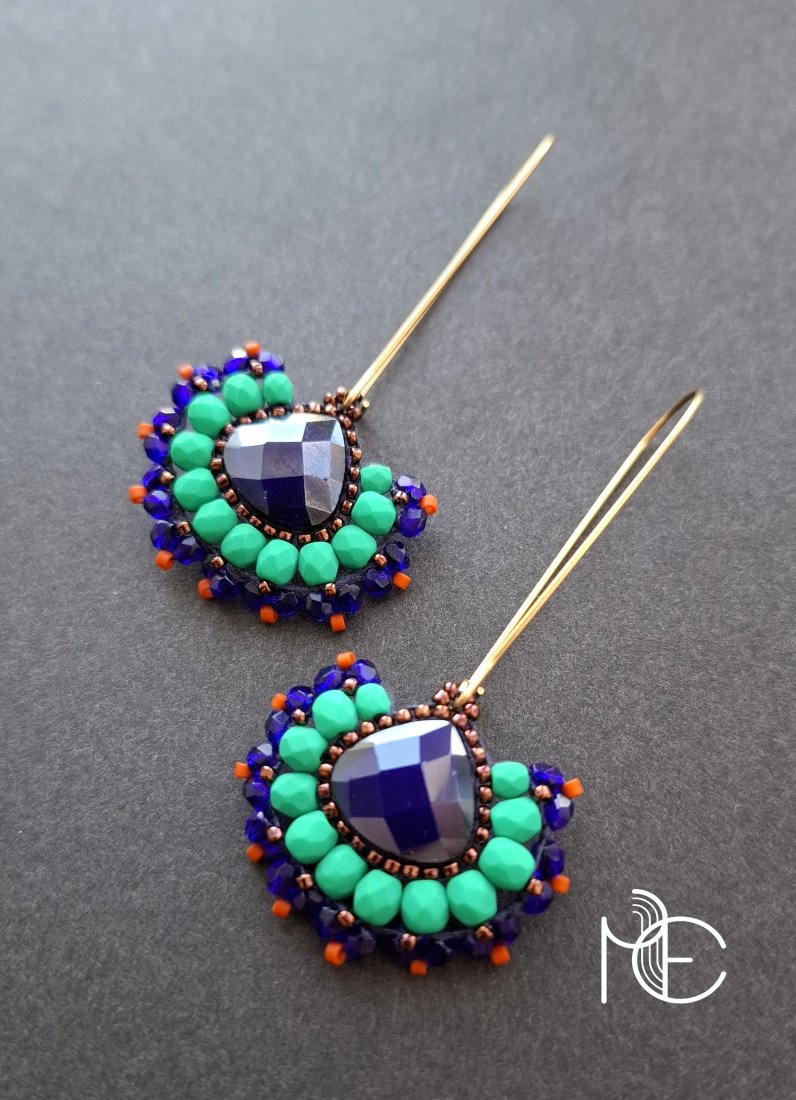 Długie kolczyki wiszące na prostych, pozłacanych biglach; wykonane techniką swoistego haftu drobnymi szklanymi jak i kryształowymi koralikami. Dwustronne podwieszone na pozłacanych i nieuczulających biglach. Wymiary: długość wraz z zapięciem - 6 cm, szerokość max. 2,8 cm. Wykonane w jedynym egzemplarzu.
