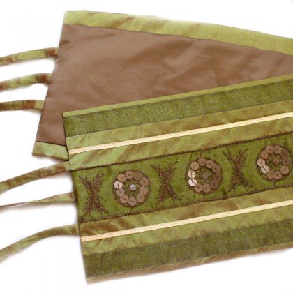 Misternie uszyty pas z tafty w kolorze zgniłozielonym z delikatnym połyskiem ceglastym ozdobiony taśmami oraz wstążeczkami do noszenia w talii jak pas do kimona. Świetnie pasuje do prostej sukienki jak i do jeansów. Pasek wiązany jest z tyłu na paseczki szerokości 1 cm. Długość pasa 73 cm, szerokość 16,5 cm, długość paseczków do wiązania 47 cm. Najmniejszy obwód 73 cm. Od spodu zgniłozielona podszewka. Kliknij na zdjęcie aby zobaczyć więcej ujęć.