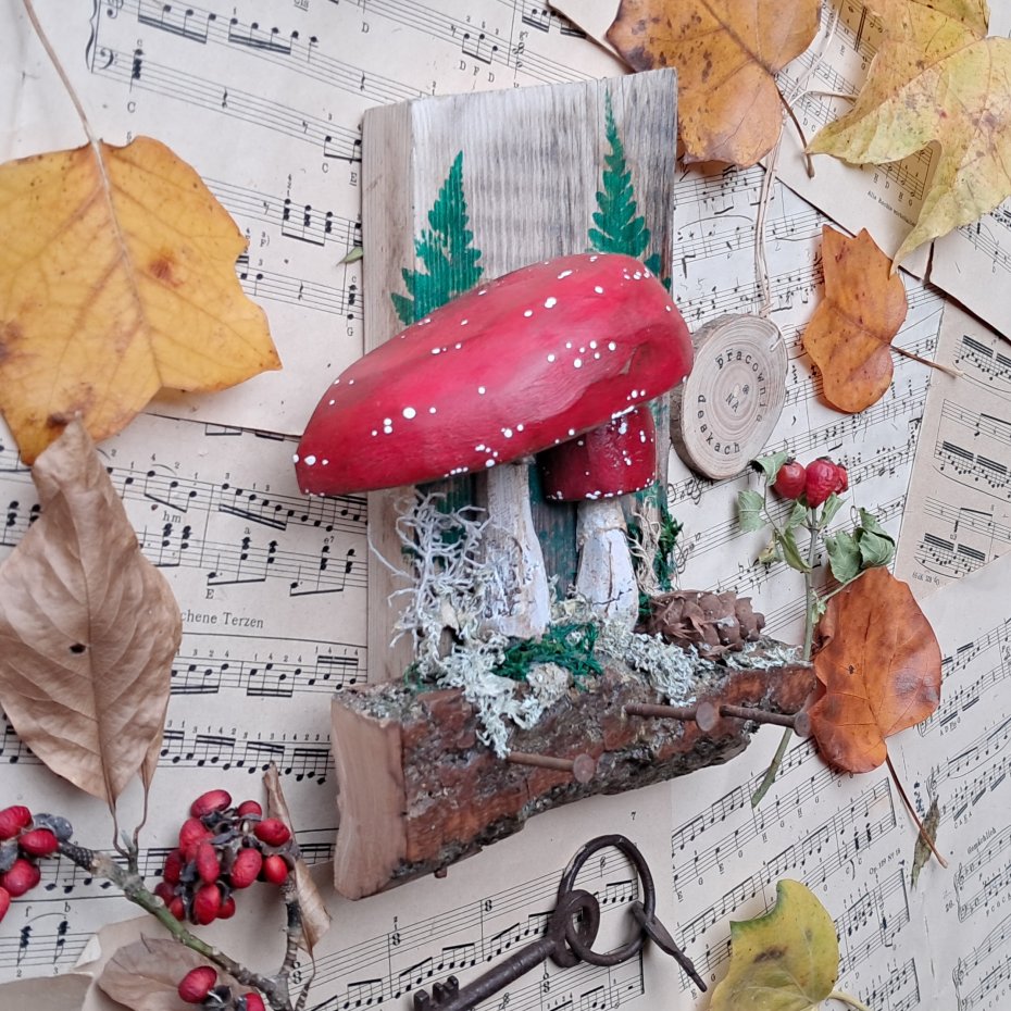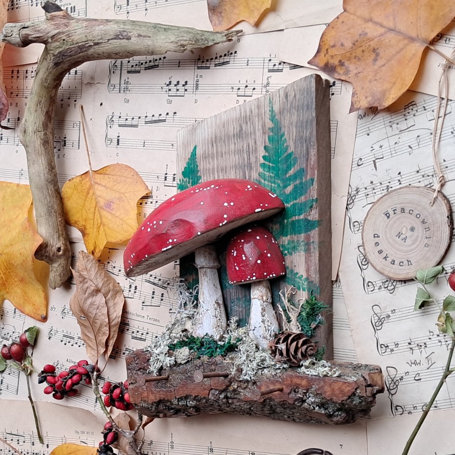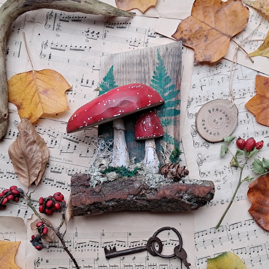 Dla wszystkich wielbicieli drewna i naturalnych dekoracji proponuję naturalny wieszak z muchomorkami z naturalnymi machami i porostami.