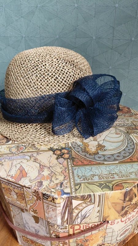 Nowy letni kapelusz z naturalnego, przewiewnego włókna, ozdobiony efektowną, granatową kokardą z delikatnej siateczki.