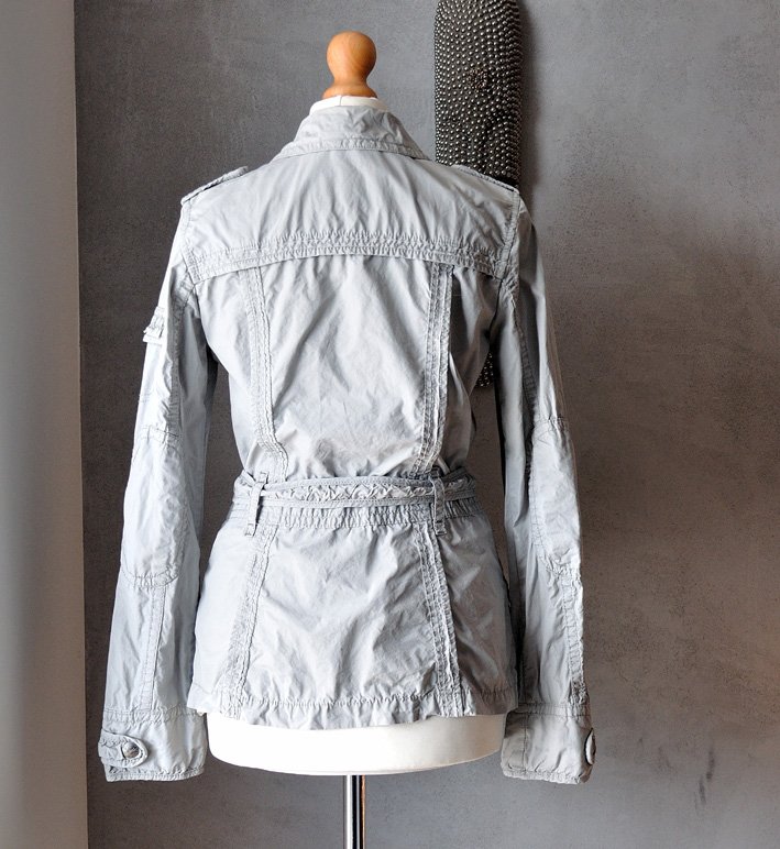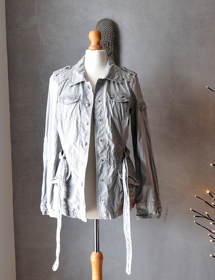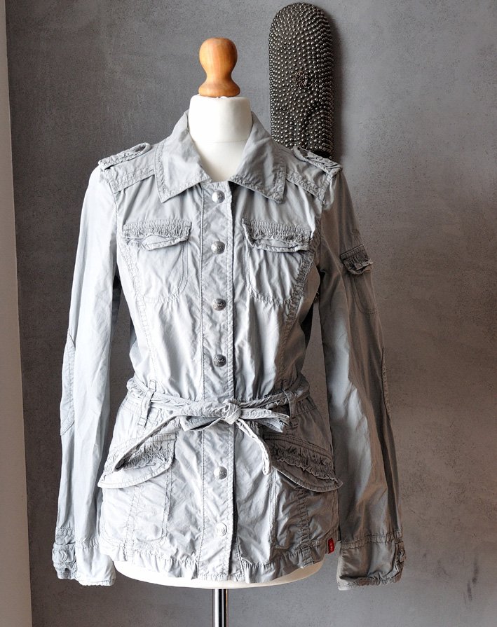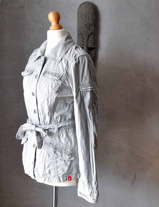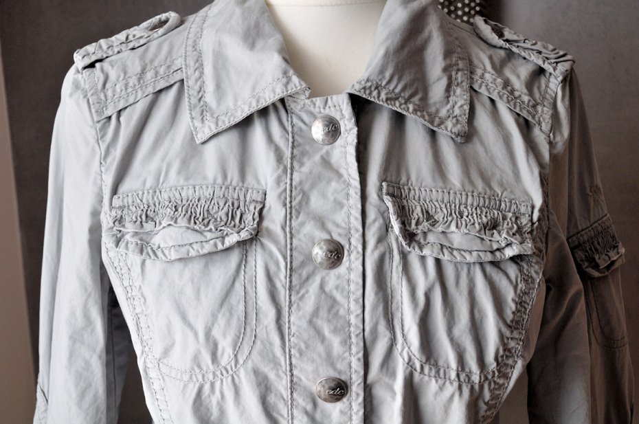 Ma niepowtarzalny, intrygujący fason. Dopasowana, z kołnierzykiem, pagonami. Zapinana na zatrzaski z metalu (duże, srebrne, postarzane guziory). W talii pasek.
