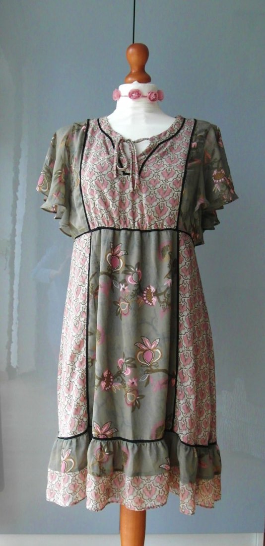 Stonowane kolory - khaki, beż, róż pudrowy. Bardzo efektownie skomponowana przez połączenie materiałów oraz smaczki w postaci "motylkowych" rękawów i falbanki u dołu. Na podszewce, wierzch z cieniutkiej żorżety.