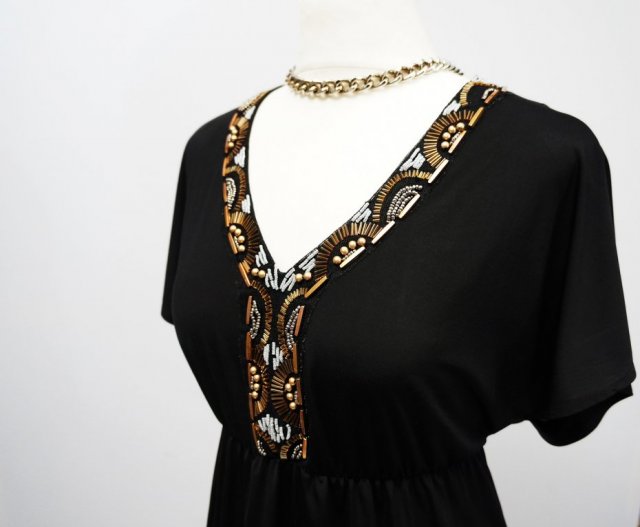 Na dekolcie ozdobiona ślicznymi aplikacjami