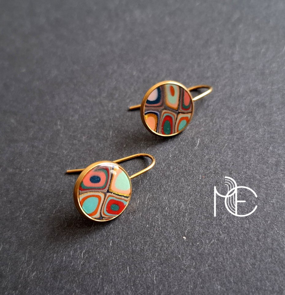 Ozdobne kolczyki wiszące wykonane z wysokiej jakości glinki polimerowej. Kolczyki o bazie pozłacanej, nieuczulającej. Wymiary - długość całkowita: 2,1 cm; średnica motywu: 1,4 cm. Wykonane w jedynym egzemplarzu.