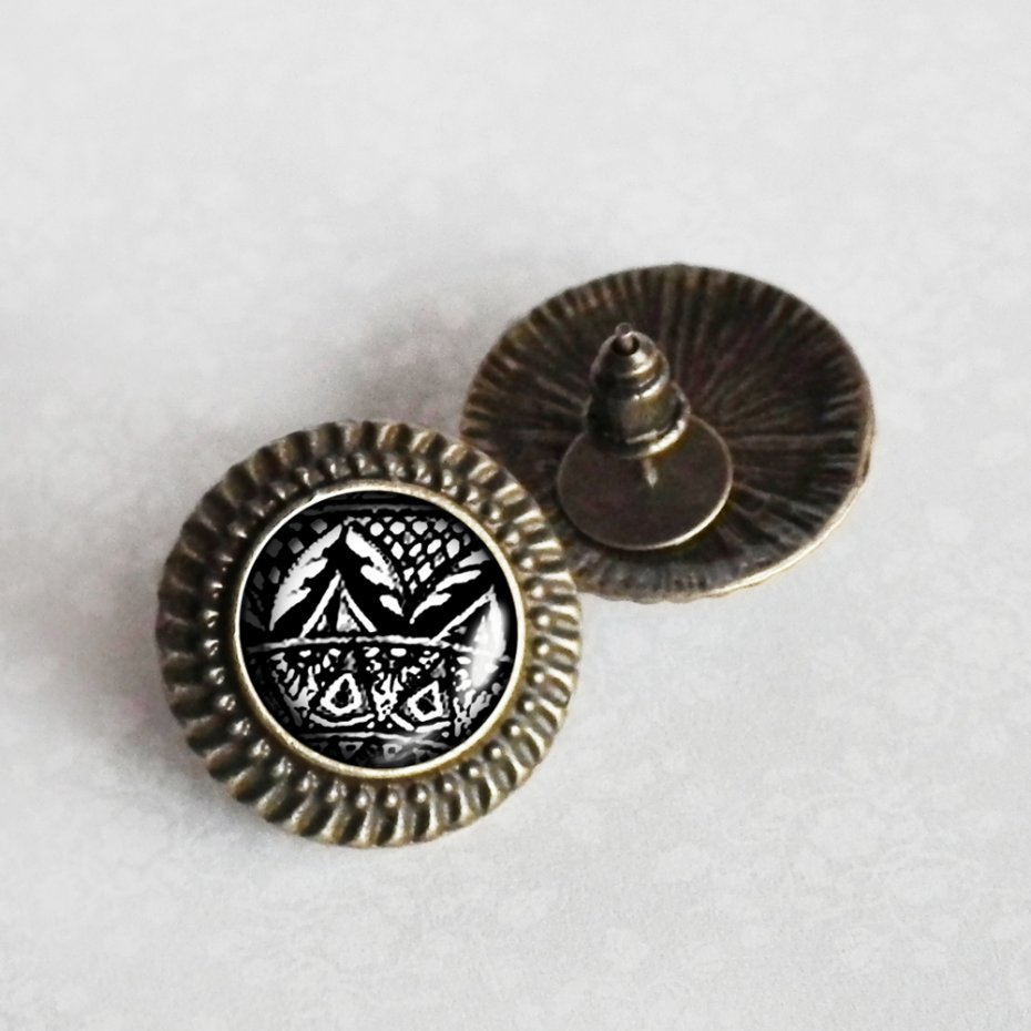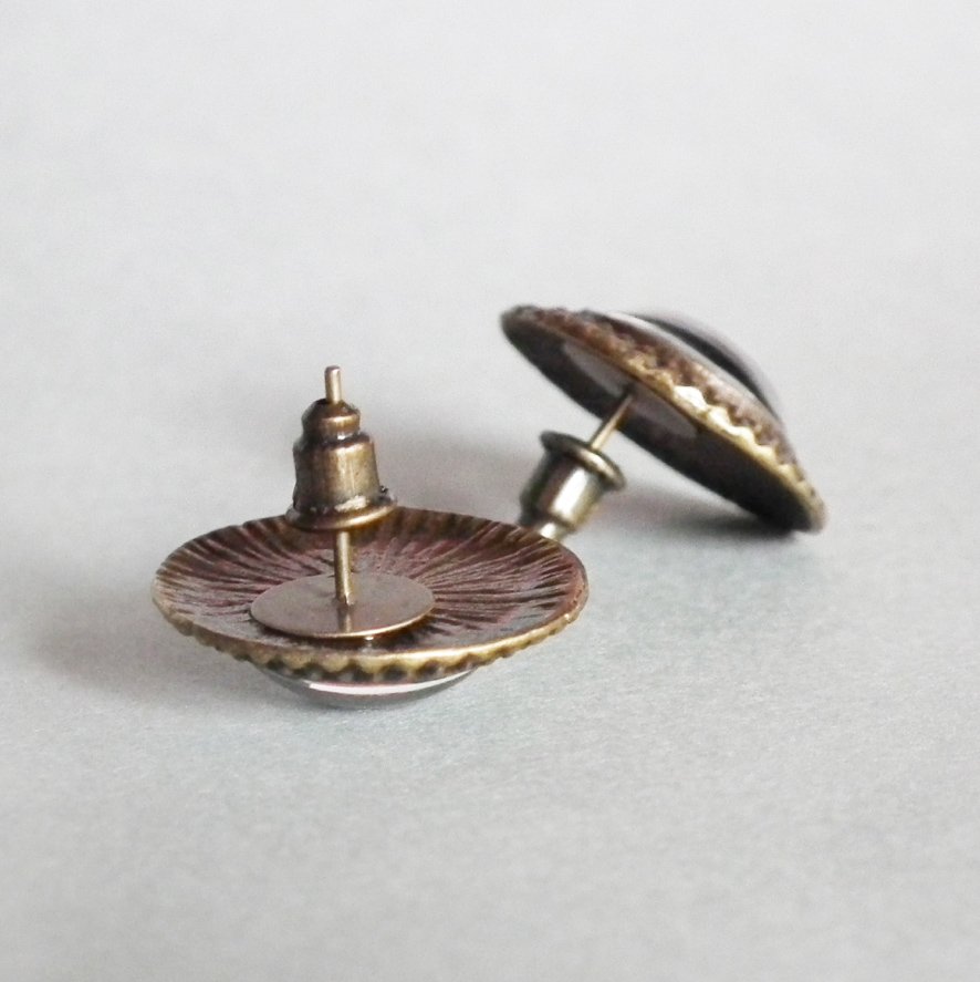 Kolczyki wkrętki z oryginalną grafiką artystyczną, zatopioną pod wypukłym szkiełkiem, w stylowej oprawie w kolorze antycznego brązu. Grafika jest najwyższej jakości. Szkła z grafiką są unikatowe, wykonane ręcznie według mojego projekt, z dbałością o każdy detal. Biżuteria nie zawiera niklu i ołowiu.