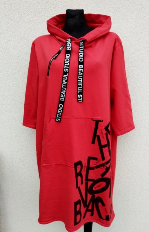 Sukienka w sportowym stylu z bawełnianej dresowej tkaniny w czerwonym kolorze, z czarnymi napisami. Minimalistyczny krój , z kapturem ściąganym ozdobną taśmą, z dużą kangurkową kieszenią.