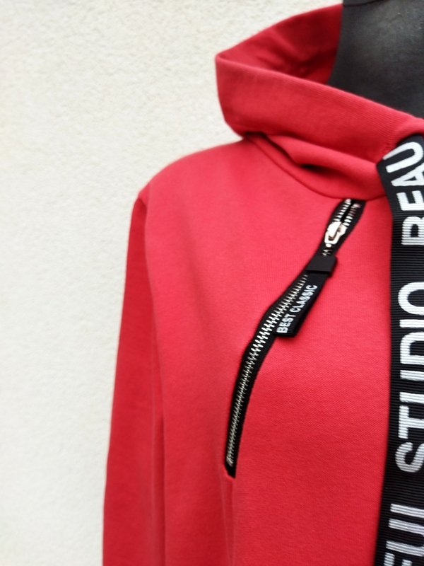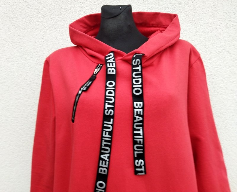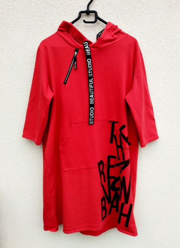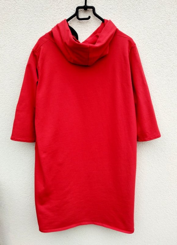 Sukienka w sportowym stylu z bawełnianej dresowej tkaniny w czerwonym kolorze, z czarnymi napisami. Minimalistyczny krój , z kapturem ściąganym ozdobną taśmą, z dużą kangurkową kieszenią.