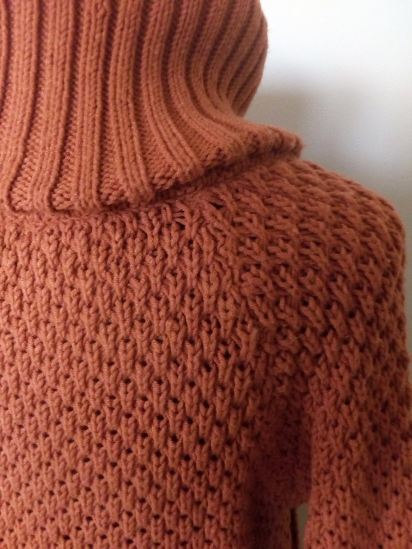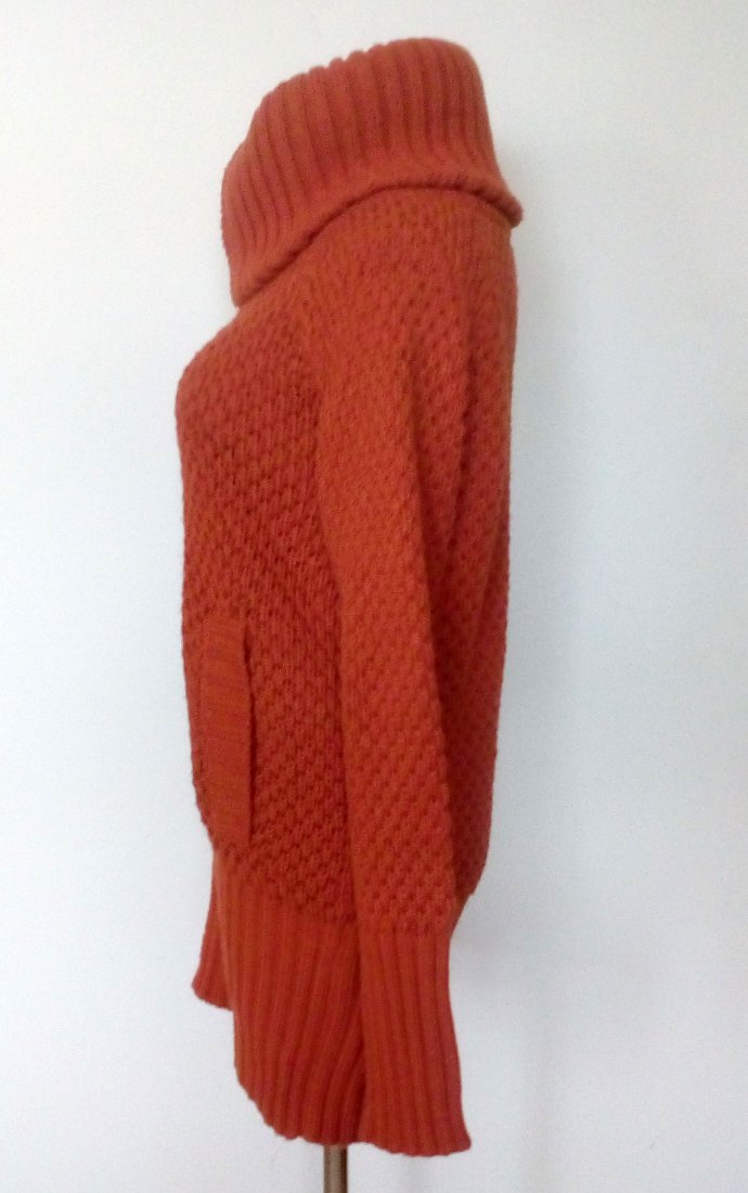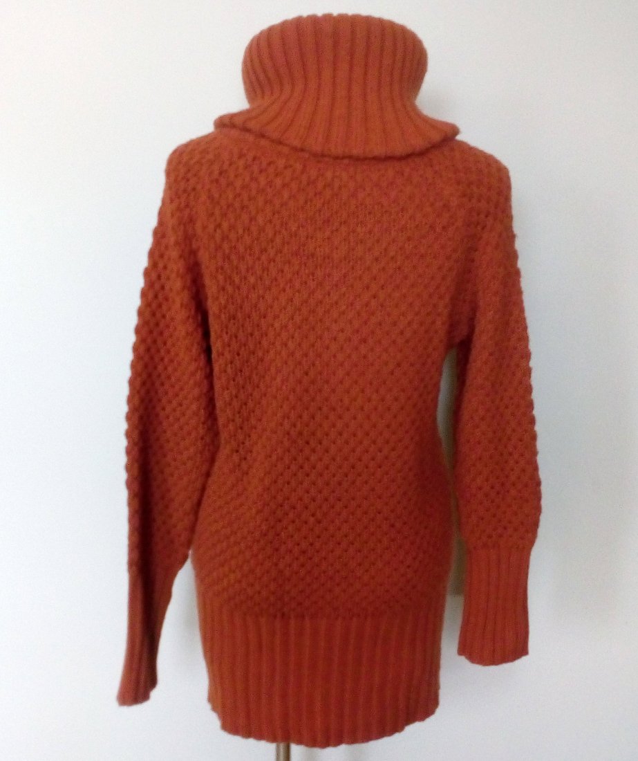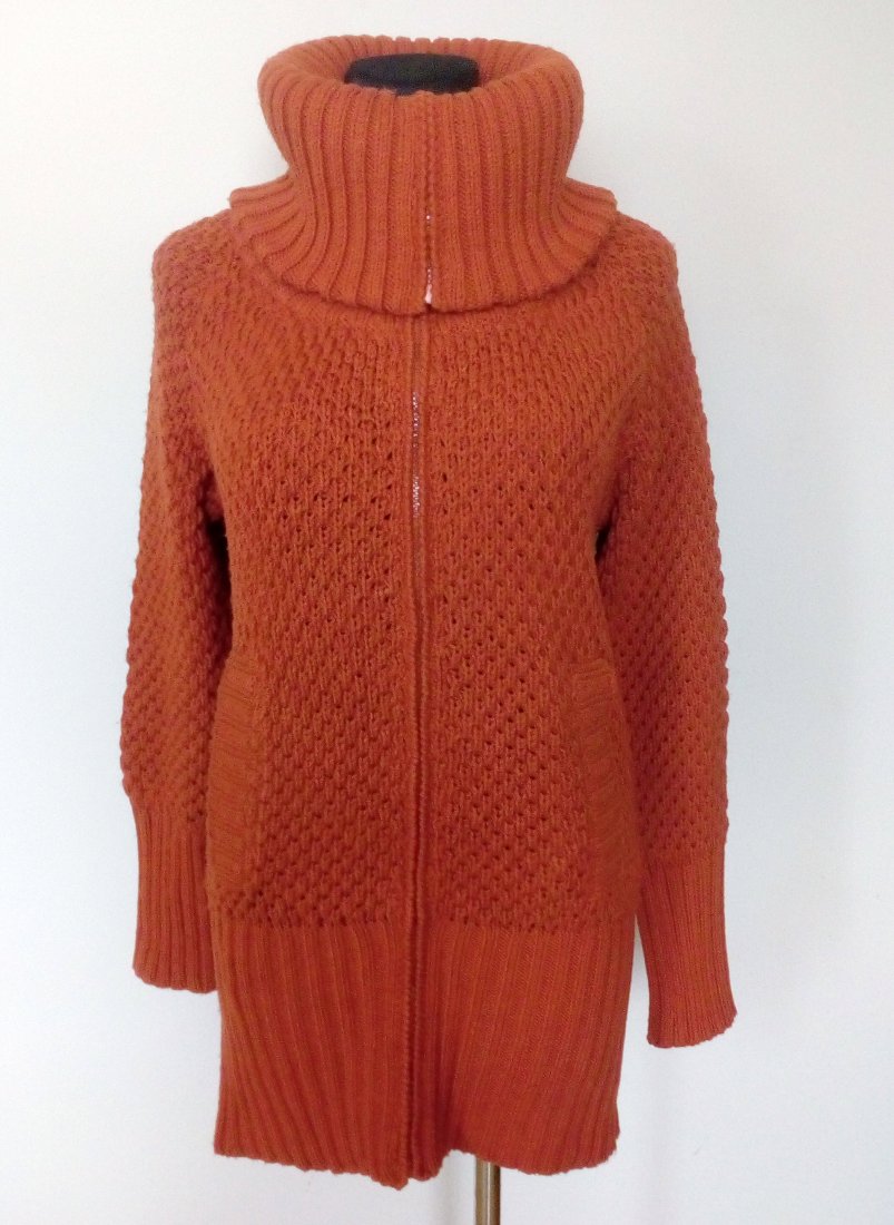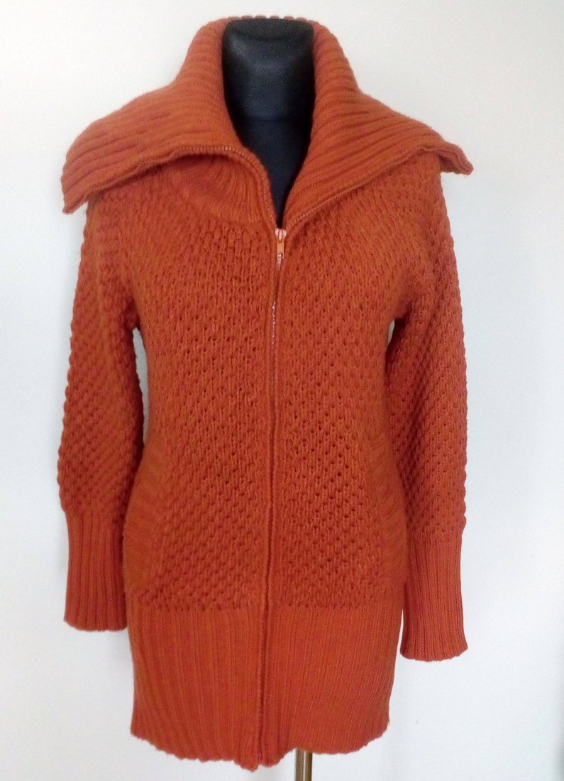 Ciepły, miły sweter w koniakowym kolorze, zapinany na plastikowy zamek, przy szyi duży kołnierz, który po zapięciu tworzy odwijany golf, z przodu pionowo wpuszczane kieszenie, u dołu i przy rękawach wysoki ściągacz, rękaw raglanowy