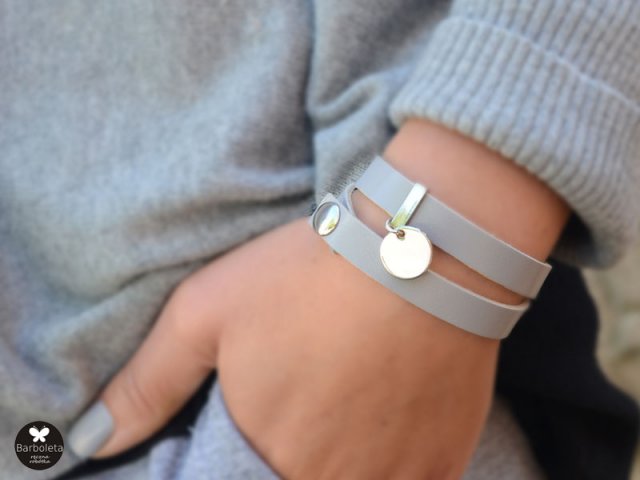 Bransoletka w minimalistycznym stylu, wykonana z wysokiej jakości skóry naturalnej jasnej w odcieniu szarości. Elementy metalowe w kolorze srebra. Zapinana na metalowy zatrzask w kolorze srebra. Przykładowe zdjęcie przedstawia duet z bransoletką w odcieniu nude/puder róż z wykończeniem w kolorze złota.