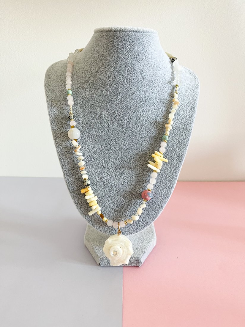Wyjątkowa, letnia kompozycja inspirowana morskimi opowieściami. Centralnym punktem naszyjnika jest duża muszla naturalna, która przyciąga wzrok i dodaje całości niepowtarzalnego charakteru. Całość wykonana jest z artystycznego miksu kamieni naturalnych: intensywnego koralowca, subtelnej masy perłowej, kontrastowego jaspisu dalmatyńskiego, delikatnego kwarcu różowego oraz eleganckiego hematytu czy nawet ceramiki.