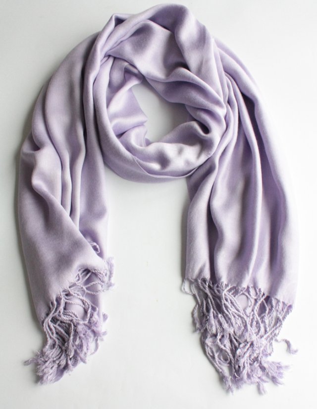 Miękki, duży szal w odcieniu jasnej lilii. Materiał to prawdopodobnie wiskoza.