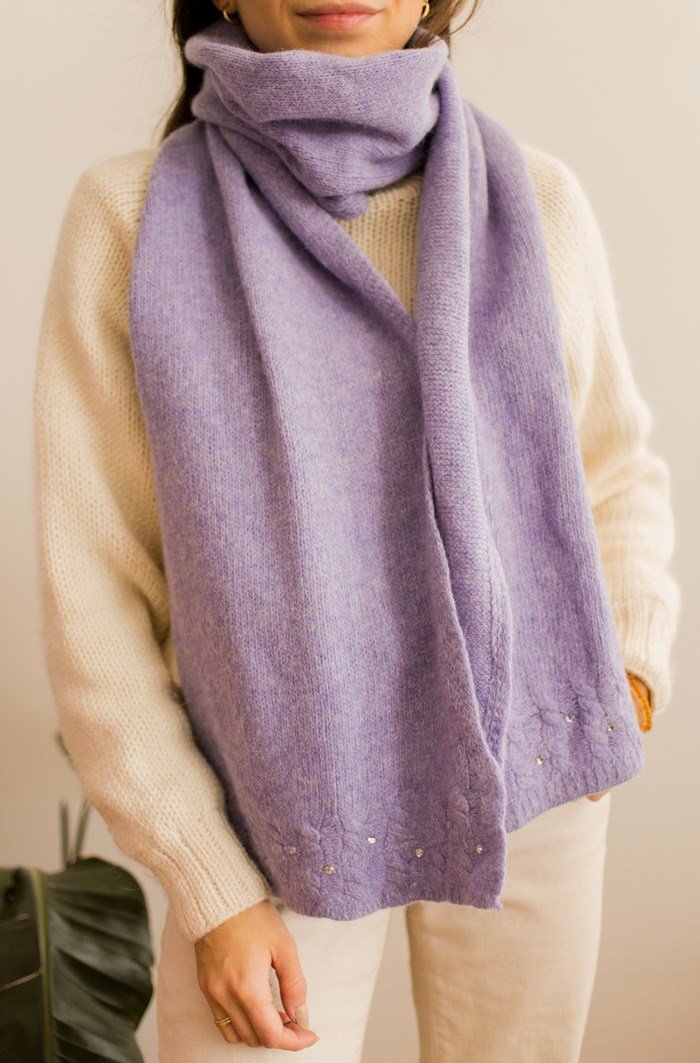 Liliowy, wełniany szalik z diamencikami.