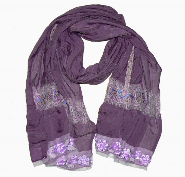 Pięknie zdobiony liliowy szal. Wzdłuż całego szala naszyta wąska koronkowa taśma, na końcach pasy szerokiej haftowanej koronki oraz tiulowej taśmy, na którą naszyto drobne cekiny i kwiaty ułożone z wstążki.