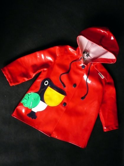 Śliczny, niemiecki płaszczyk przeciwdeszczowy dla dziecka. Firmy LILIPUT. Zapinany na zatrzaski.Z przodu aplikacja-pelikan z kieszonką. Kapturek ściągany tasiemką.