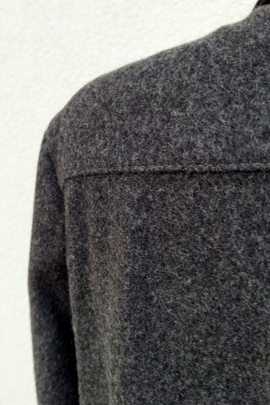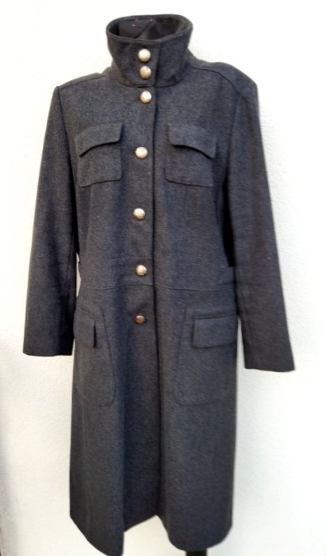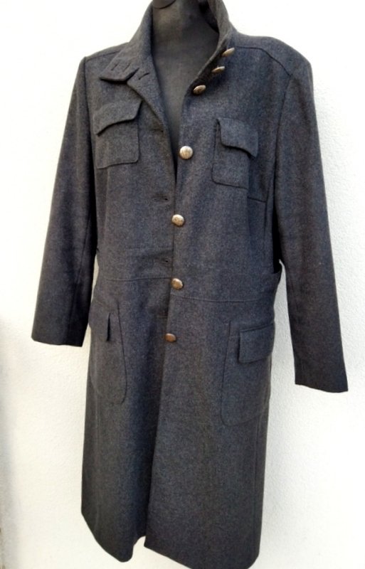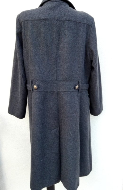 Płaszcz z flauszowej tkaniny w kolorze grafitowej czerni . Odcinany w pasie , po bokach patki z guzikami. Z kołnierzem typu wyższa stójka, z czterema kieszeniami z patkami, z rozcięciem z tyłu. Zapinany na metalowe guziki w kolorze starego srebra. całość na podszewce.