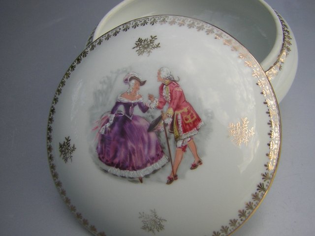 Ogromne Porcelanowe Puzdro sygnowane jakością LIMOGES FRANCE. Ciepła biel porcelany i ciekawe zdobienie. Para w dawnych strojach - romantyczna,. pałacowa w delikatnych, przyjemnych barwach i symbolicznej pozie. Delikatne złocenia na rantach i ozdoby na przykrywce.. Całość na błyszcząco wykończona. Na łakocie, na biżuterię. puder, drobiazgi łazienkowe....według potrzeb i uznania do zastosowania ;)