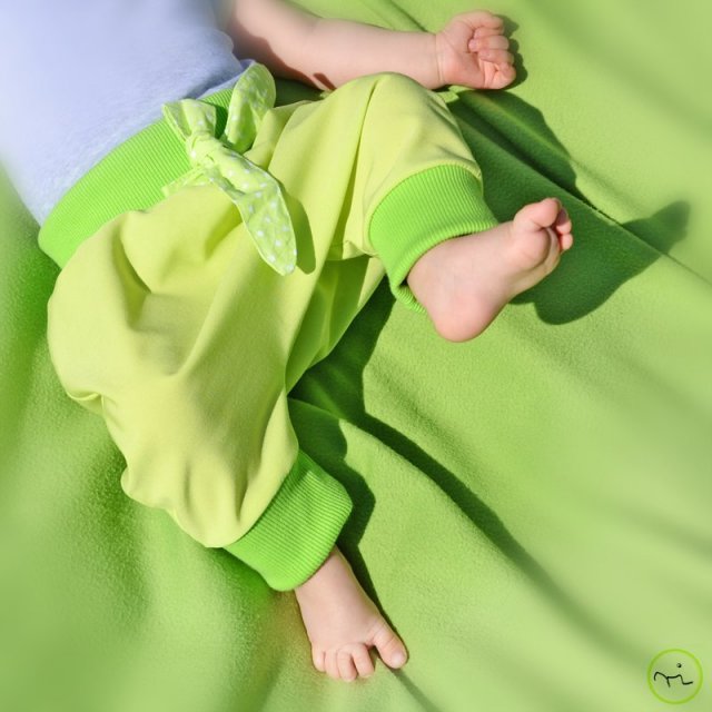 Śliczne portki w dwóch odcieniach limonki dla malucha wykonane z bawełny z elastanem. Bardzo wygodne, luźne, przyjemne w dotyku. Spodenki wykończone ściągaczem z kokardką w kropeczki w pasie.
