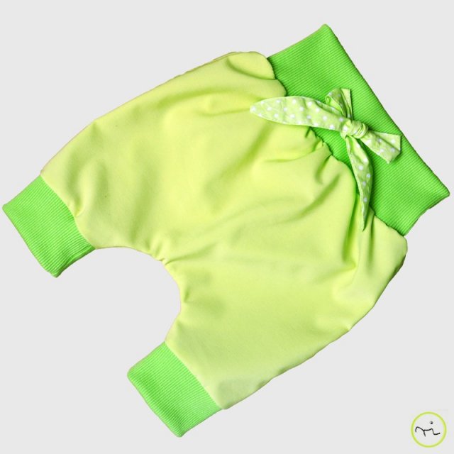 Śliczne portki w dwóch odcieniach limonki dla malucha wykonane z bawełny z elastanem. Bardzo wygodne, luźne, przyjemne w dotyku. Spodenki wykończone ściągaczem z kokardką w kropeczki w pasie.