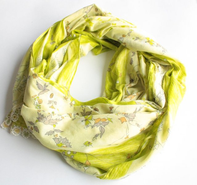 Duży, miękki szal wykończony koronką. Szal został wykonany według mnie z bawełny lub wiskozy.