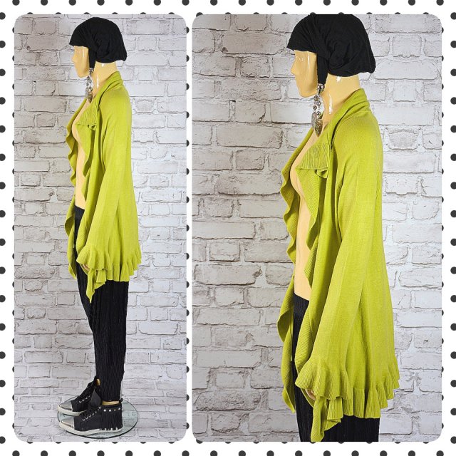 Dłuższy limonkowy sweter o otwartym kroju wykonany z bardzo przyjemnej dzianiny, sweter nie jest zapinany , delikatnie asymetryczny- boki troszkę dłuższe, tył krótszy, przy brzegach posiada delikatny ala żabot , który idzie do samego dołu swetra dzięki czemu sweter pięknie "opada ".