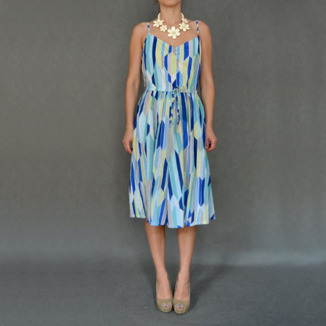 Sukienka w graficzne wzory w kolorach niebieskiego, granatu, limonki i szarości. Na ramiączkach, w talii ściągana. Na podszewce.