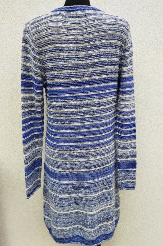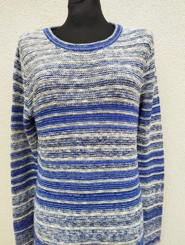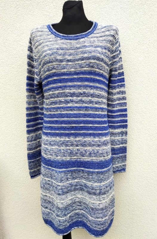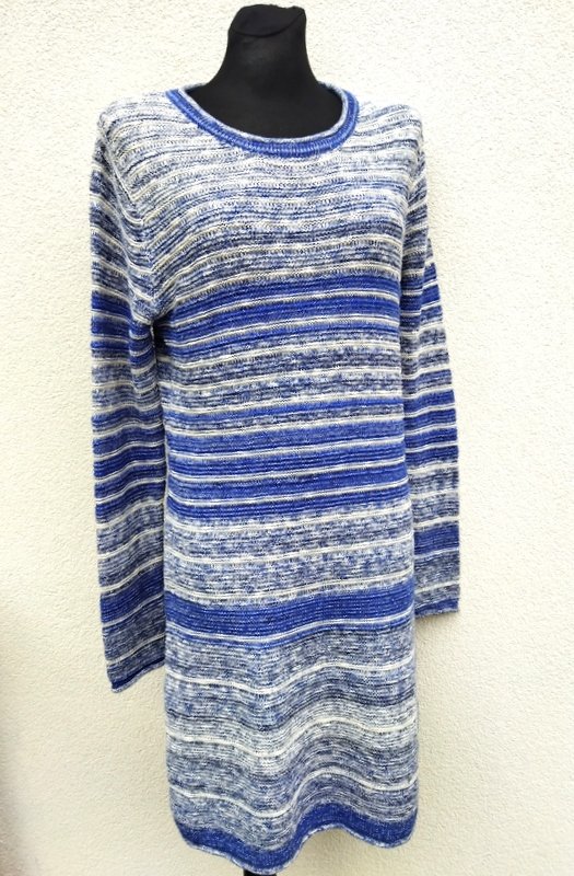 Sweterkowa sukienka z dużym udziałem bawełny w składzie w melanżowej kolorystyce odcieni niebieskiego koloru( ultramaryna) i złamanej bieli. ołówkowy fason z owalnym dekoltem, wykończony zrolowanymi pliskami. Miła , podatna i rozciagliwa