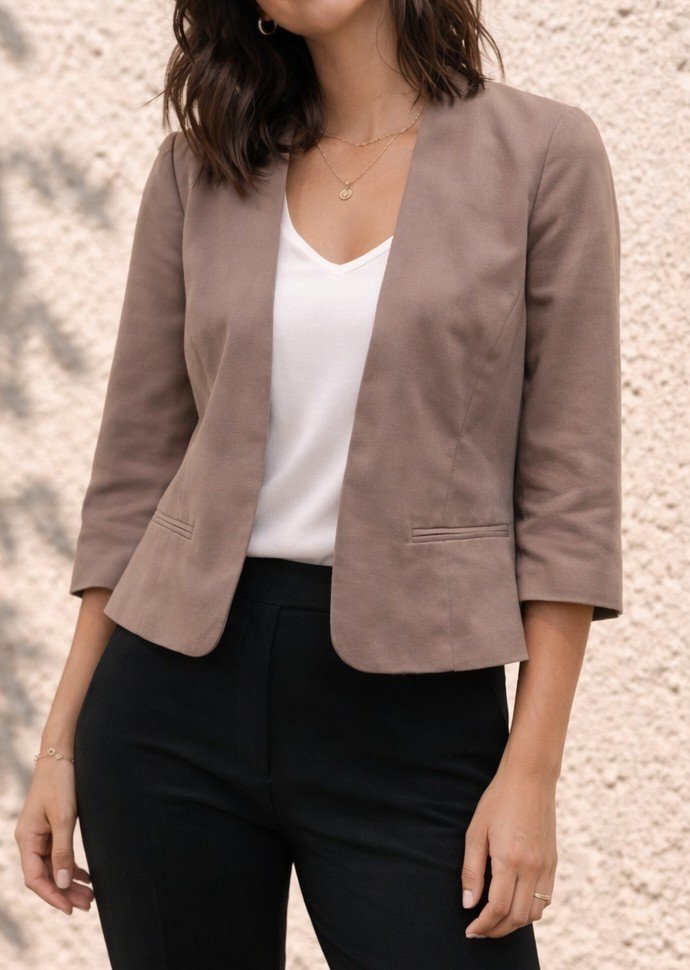 Elegancki krótki żakiet idealny jako dopełnienie okazjonalnego stroju.