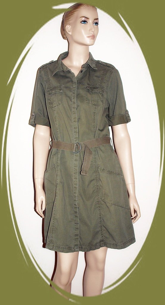 sportowa Sukienka marki lindex w kolorze ciemnej oliwki. Materiał 100% sztywniejsza, lekko dekatyzowana bawełna. Zapinana na schowane napy, możliwość podpięcia rękawów . Stan bardzo dobry. Rozmiar z metki 46 (myślę, że raczej dla 38-40), na manekinie o rozmiarze 38. Podaję wymiary mierzone na płasko;