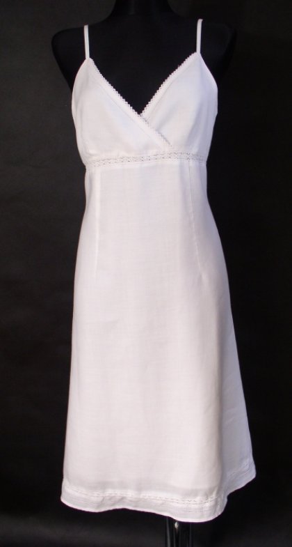 Piękna,elegancka sukienka firmy LINDEX.Rozmiar 44.Materiał len,podszewka biała syntetyk.Zapinana z tyłu na długi zamek.Ramiączka cienkie,regulowane.Odcięta pod biustem,szew przykryty białą,bawełnianą koronką.Staniczek skrzyżowany,brzeg obszyty białymi ząbkami i mereżką.Dół sukienki ozdobiony mereżką i białą koronką.Stan bardzo dobry.Długość mierzona od pachy 86 cm,pod pachami 108 cm.