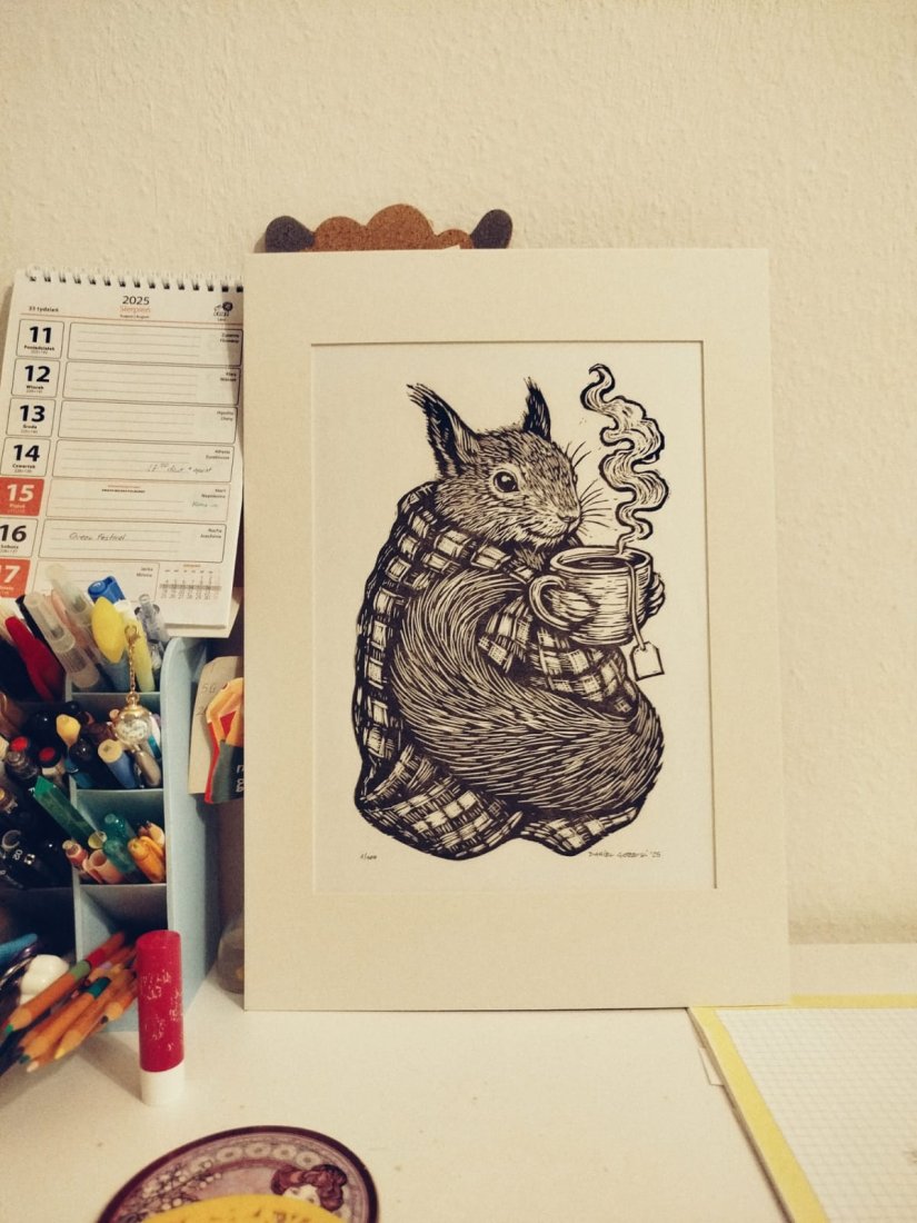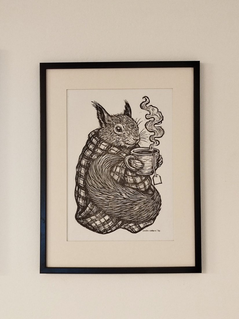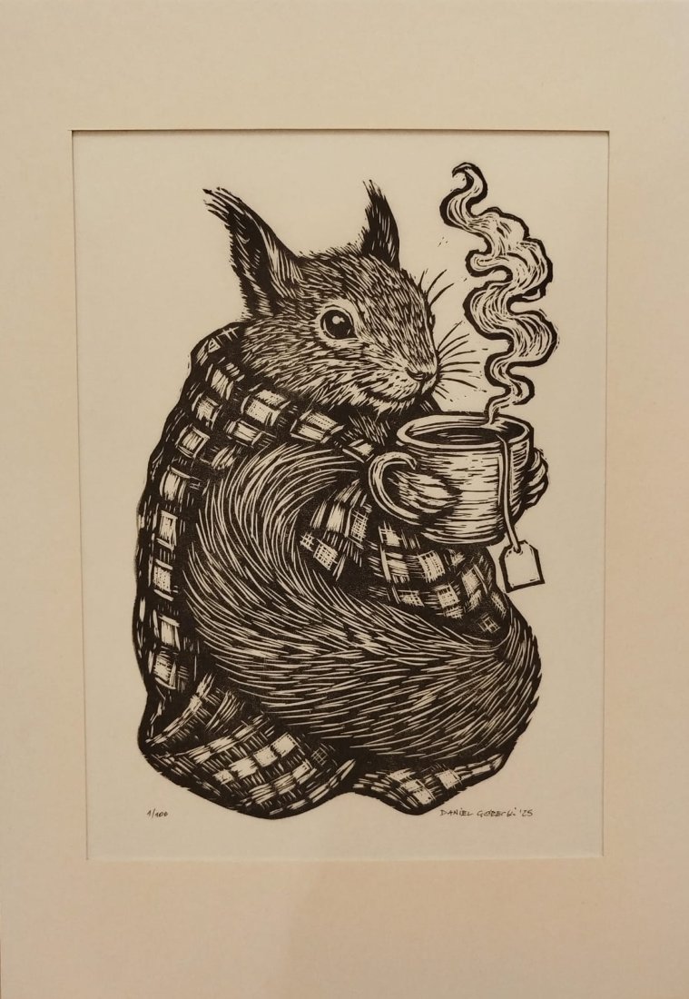 Sprzedam oryginalną, czarno-białą ilustrację przedstawiającą Wiewiórkę "Jesieniarę". Praca została wykonana techniką linorytu, co nadaje jej wyjątkowy charakter.