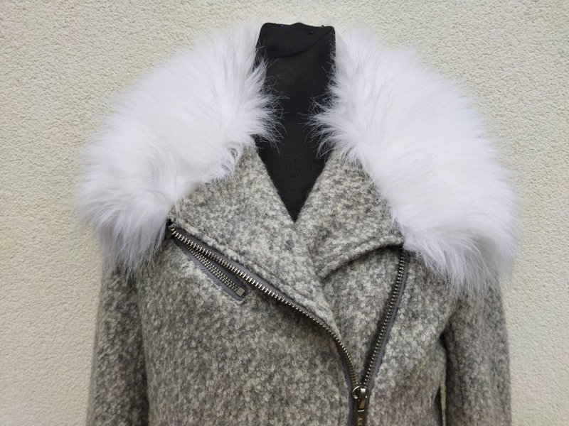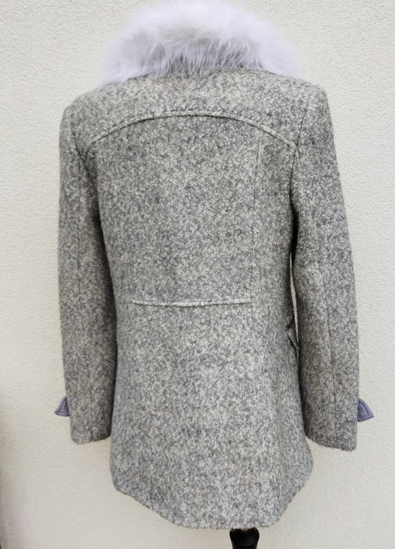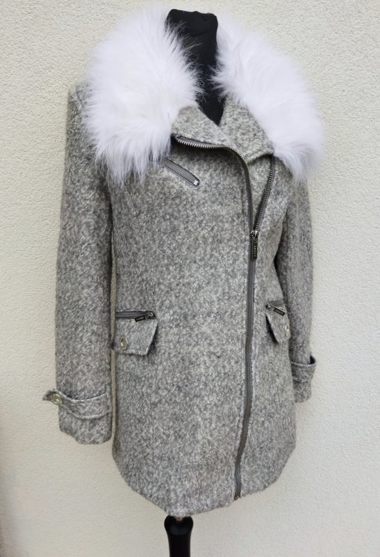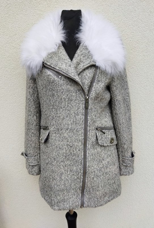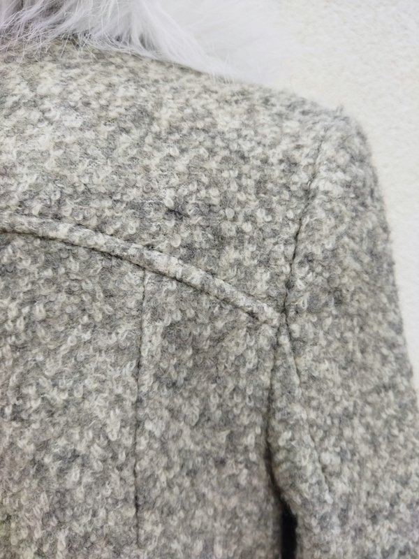 Świetna kurtka z dobrej jakości tkaniny z faktura boucle w melanżowej jasnoszarej kolorystyce. Lekko taliowana , z kołnierzem z puszystego białego futerka, z asymetrycznym zapięciem na zamek, z dwiema wpuszczanymi kieszeniami z patkami zapinanymi na sygnowane metalowe guziki w srebrnym kolorze i trzema ozdobnymi rozsuwanymi zamkami, z patkami na mankietach rękawów zapinanymi na guziki. całość na eleganckiej sygnowanej podszewce.