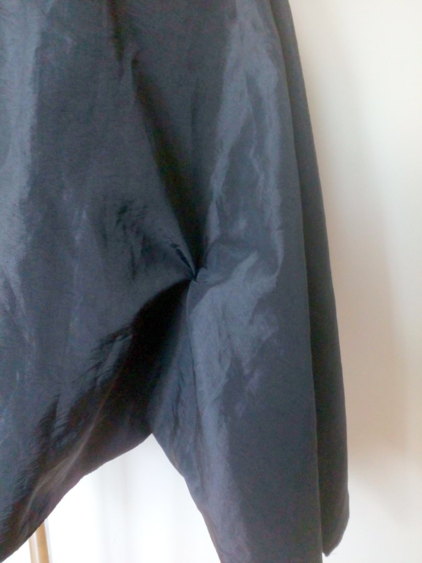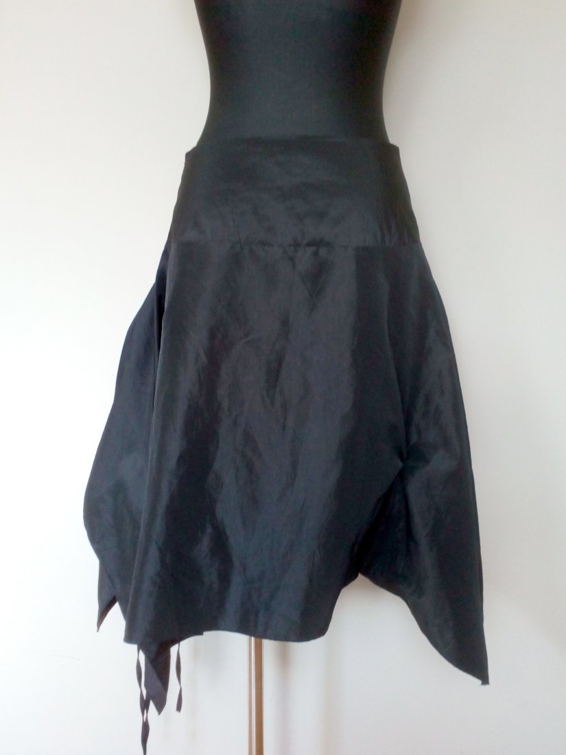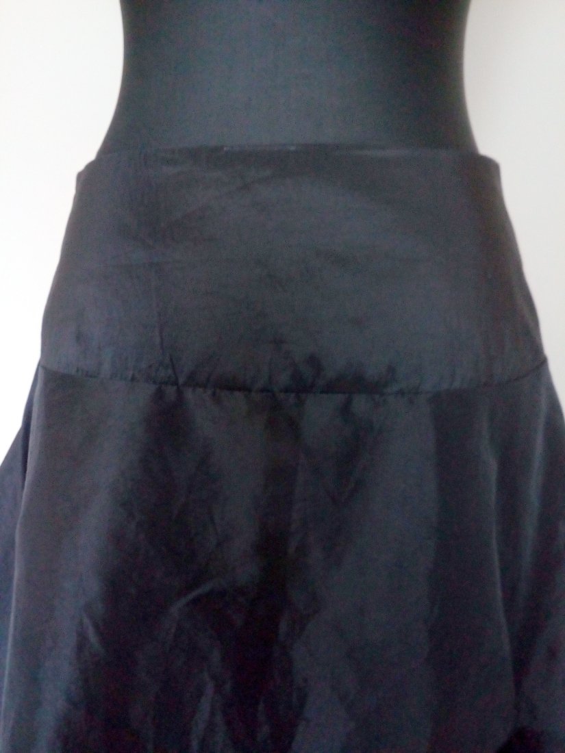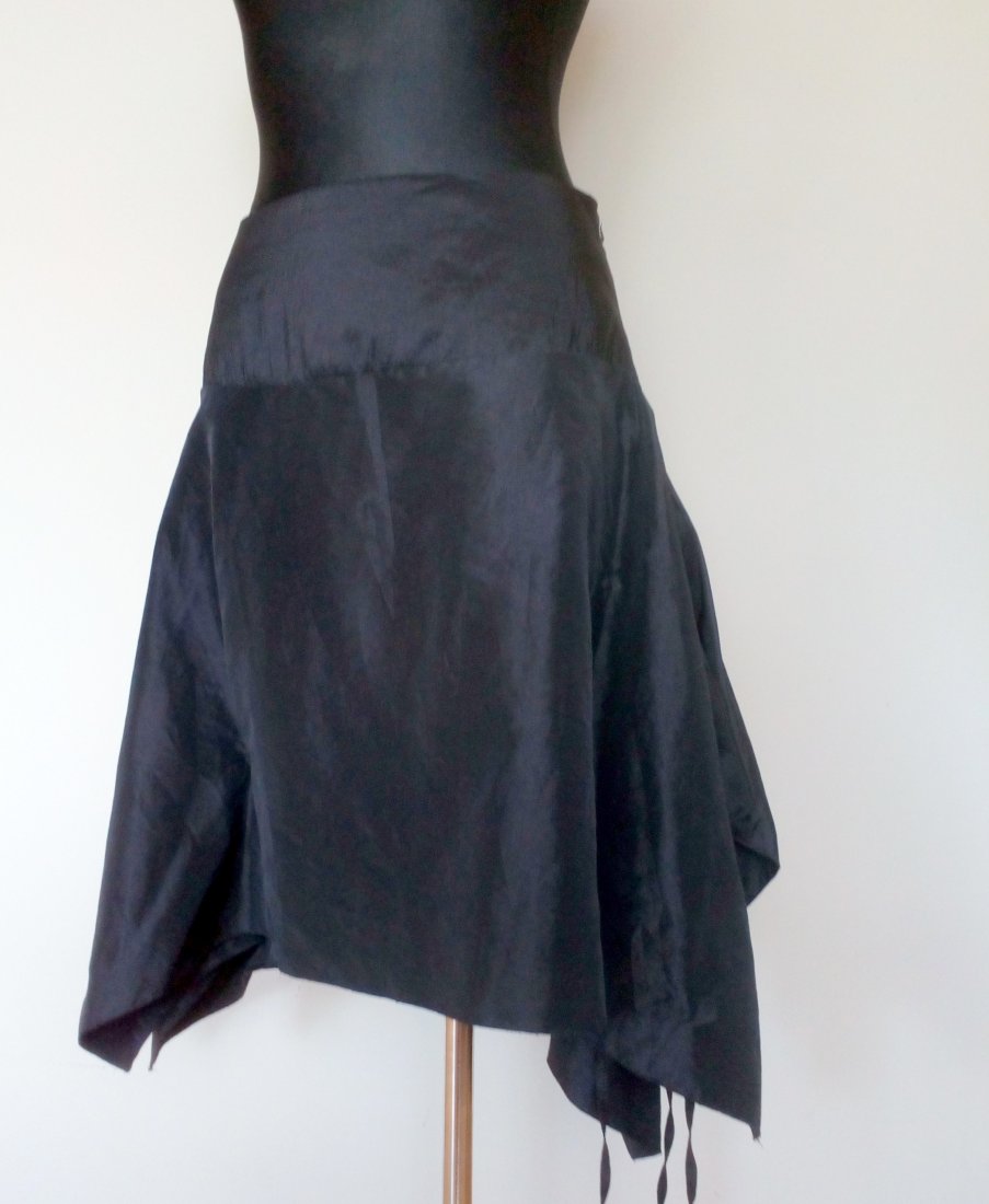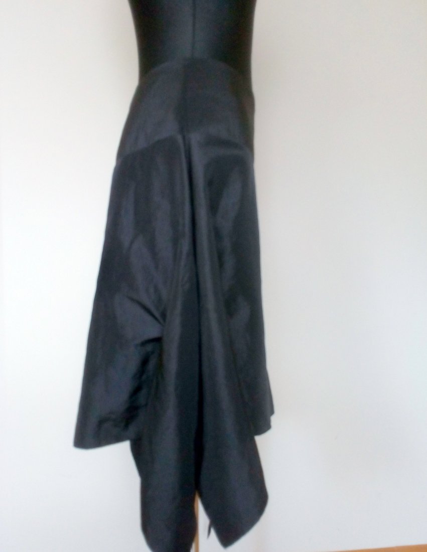 Czarna spódnica z połyskującego materiału, zapinana z boku na zamek, u góry na wysokim karczku, asymetryczna - dłuższy tył i boki, boki podwiązywane od środka trokami, od spodu na cienkiej podszewce, do podszewki doszyta podwójna falbana z czarnego tiulu