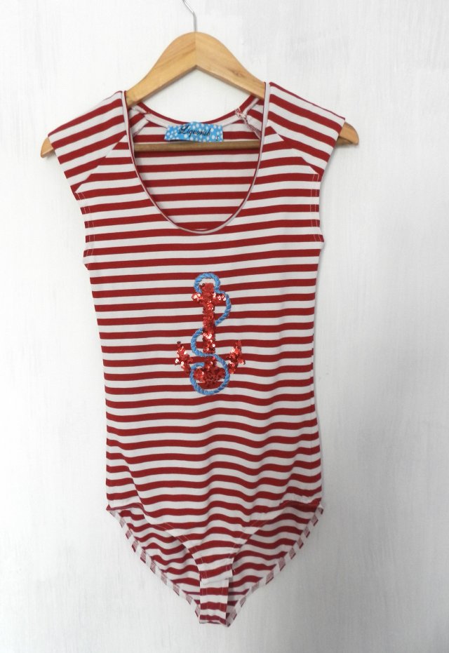 Jednoczęściowy kostium kąpielowy w czerwone - białe paski z motywem kotwicy pośrodku