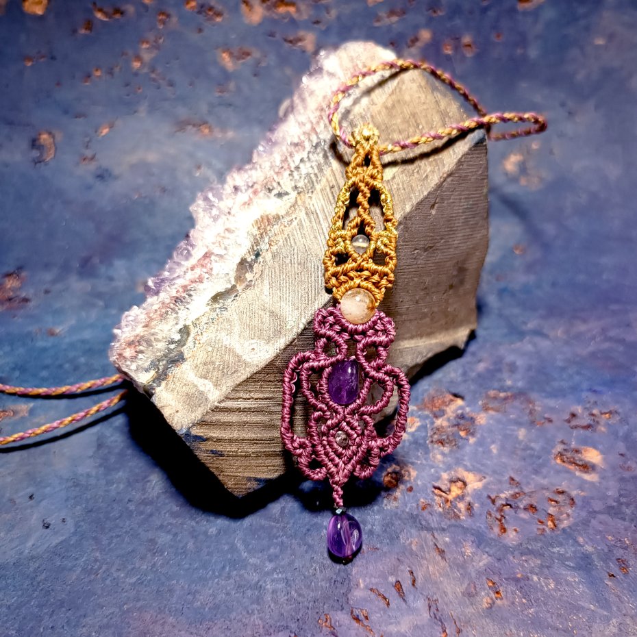 Artystyczna kompozycja kamieni naturalnych oprawionych techniką mikromakramy, wykonana ze sznurka o doskonałej jakości.