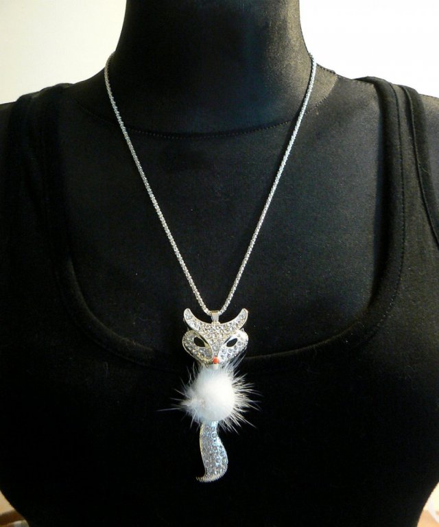 Wisior w kolorze srebra, wysadzany cyrkoniami, ozdobiony delikatnym futerkiem.