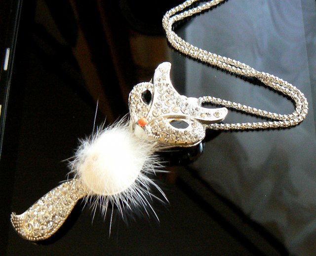 Wisior w kolorze srebra, wysadzany cyrkoniami, ozdobiony delikatnym futerkiem.